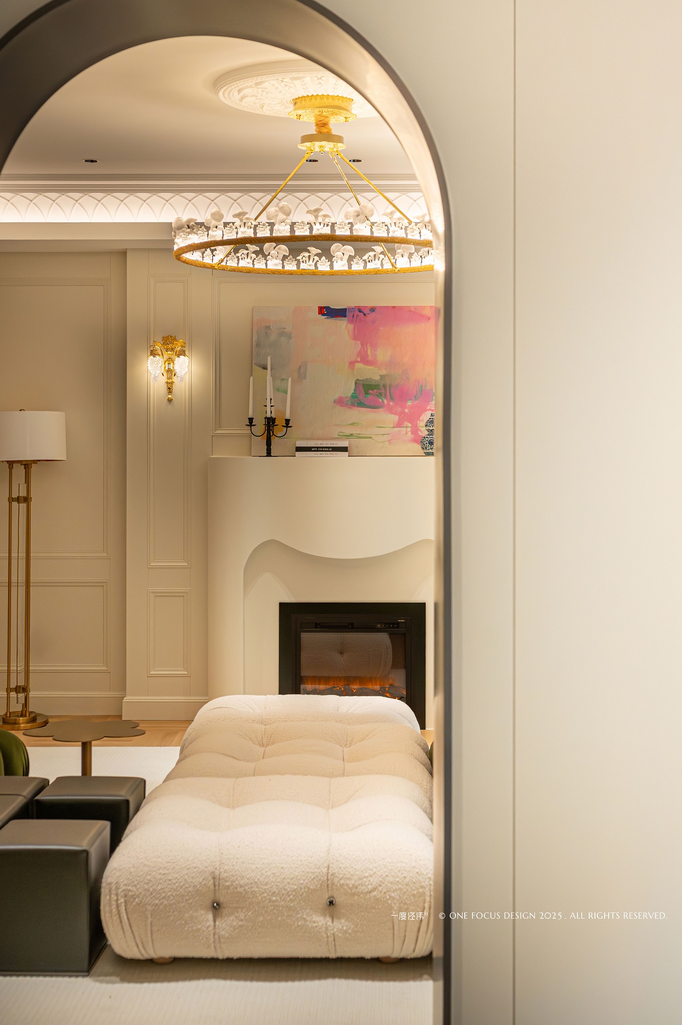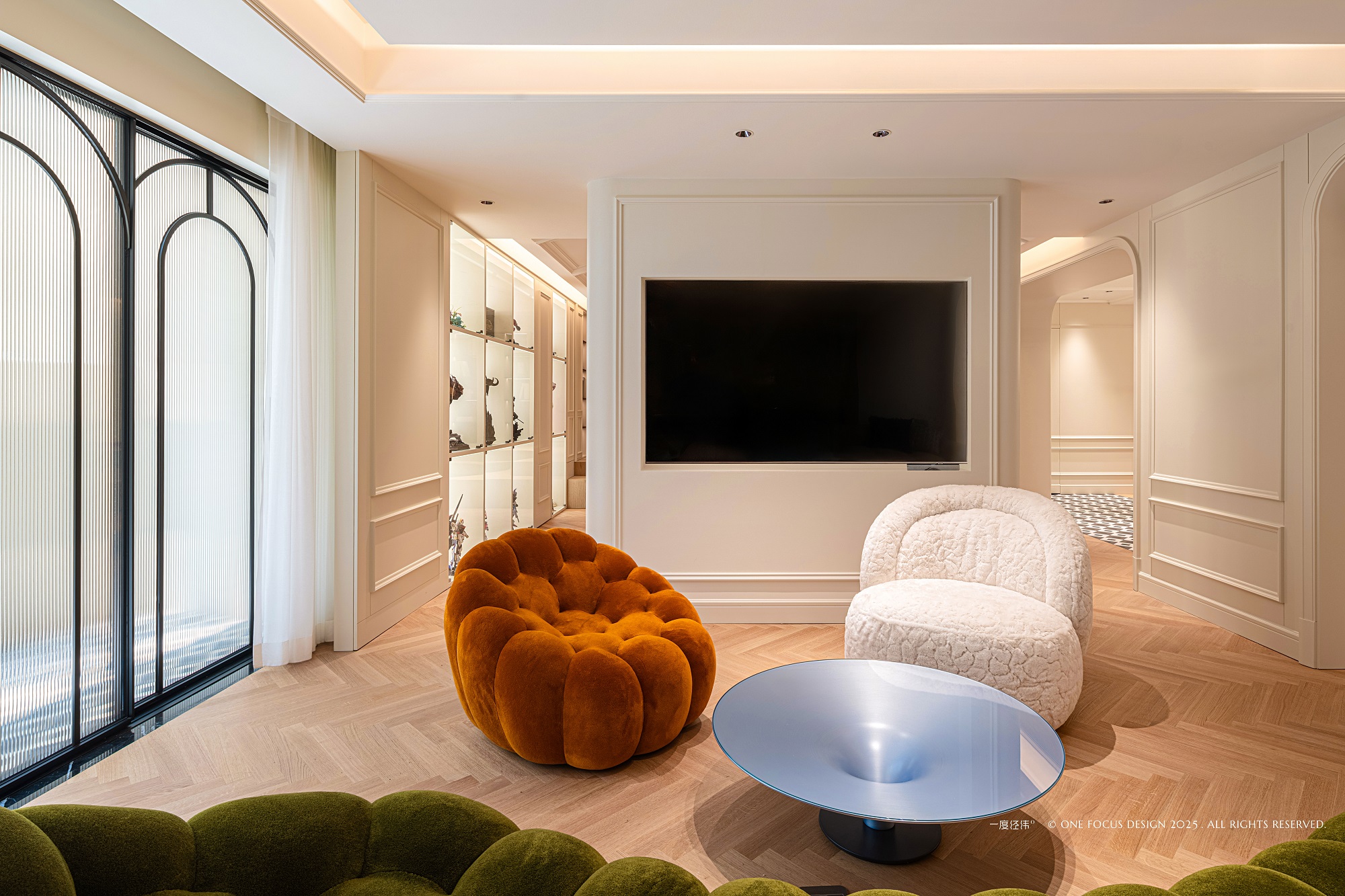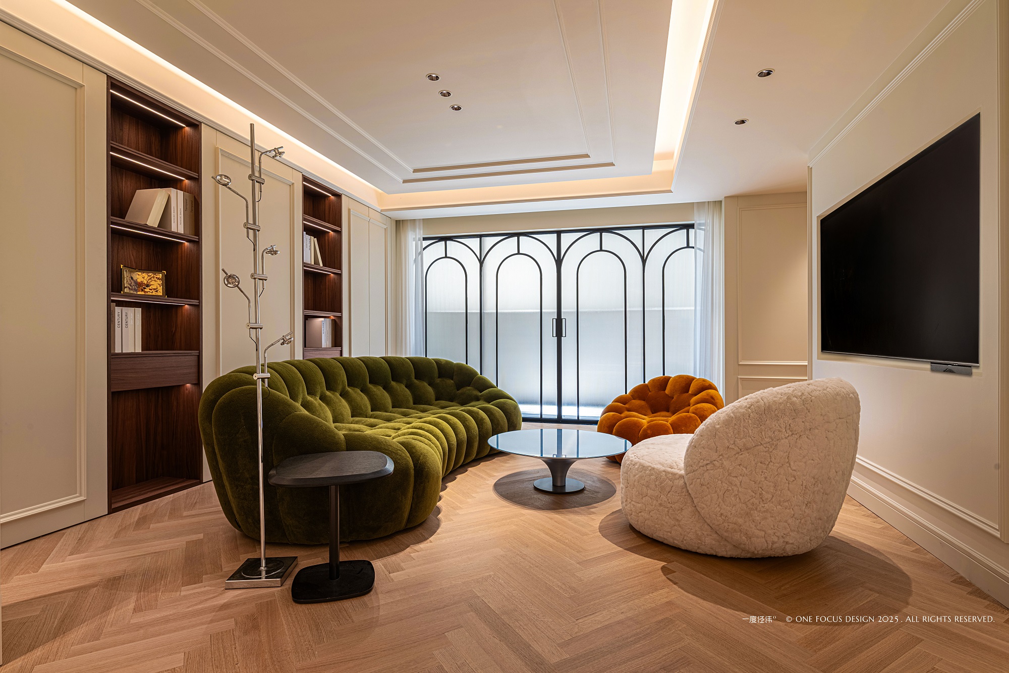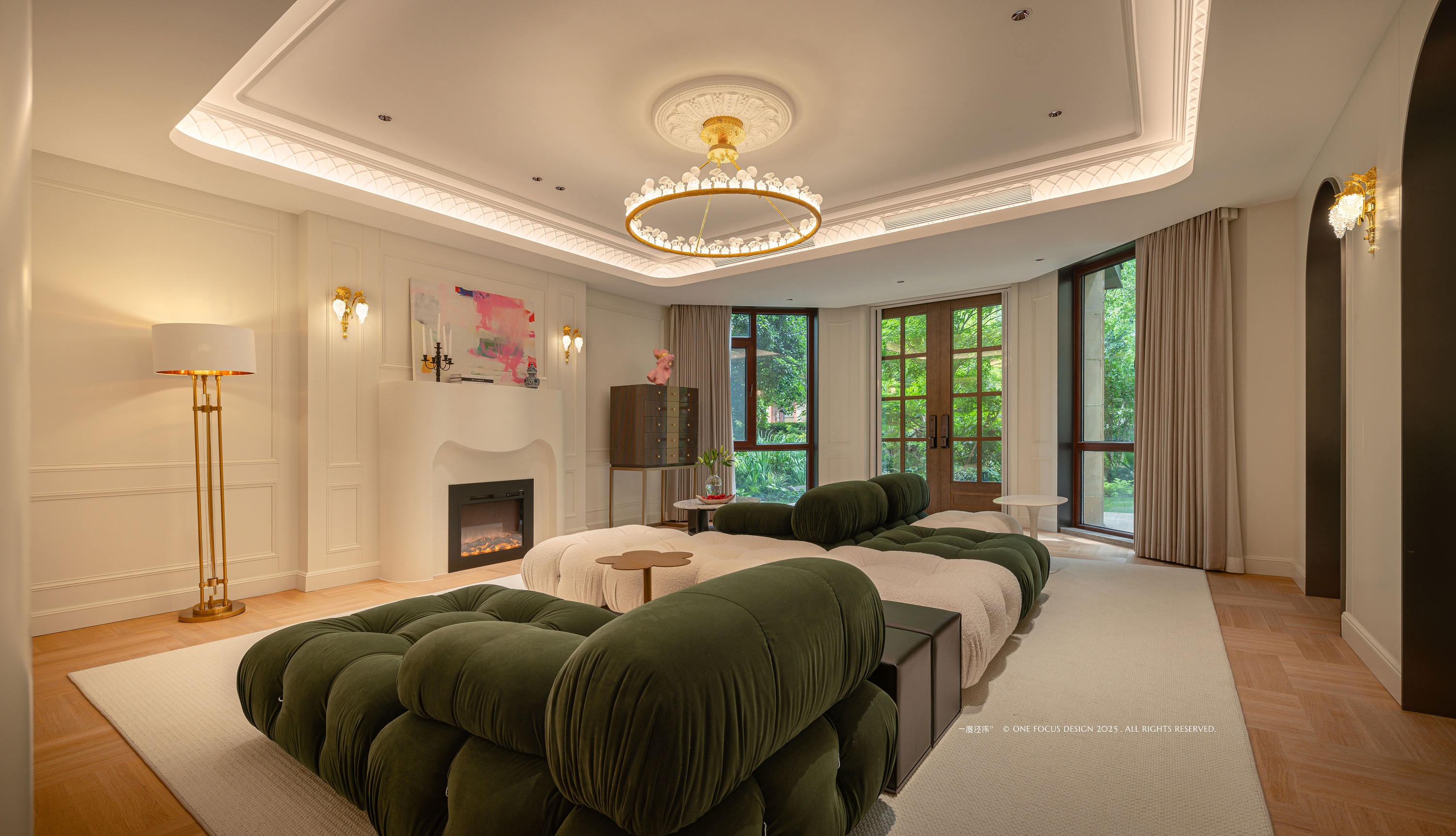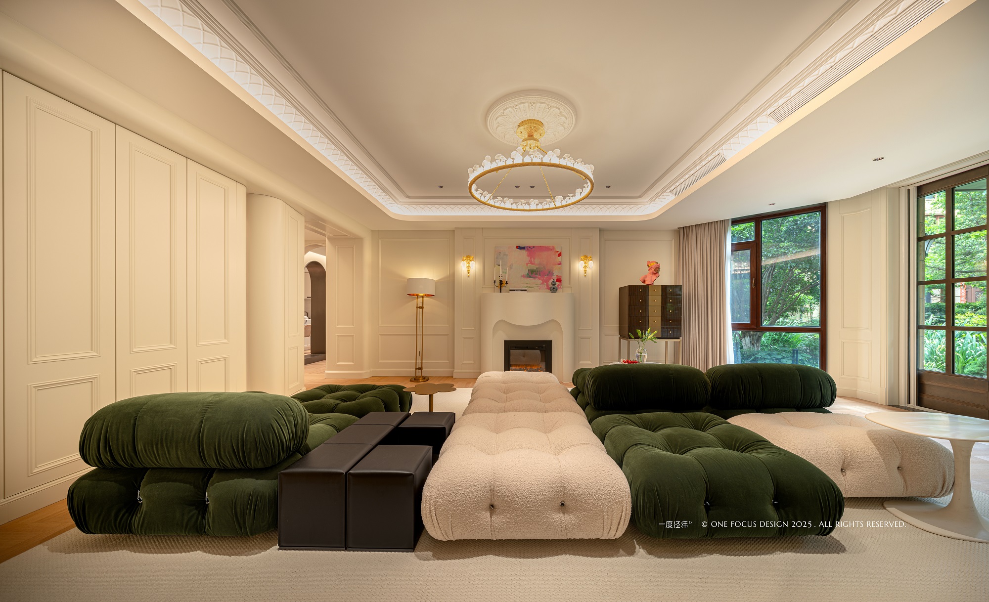 经典的法式复古线条勾勒空间轮廓,圆拱门窗流淌着时光的优雅。 在此底蕴之上,款式各异的沙发组合成为主角, 尤其那抹墨绿色的泡泡沙发,以其明亮跳脱的色彩与极致柔软的形态,犹如一件引人注目的当代艺术雕塑,为空间注入复古未来感与不羁活力。