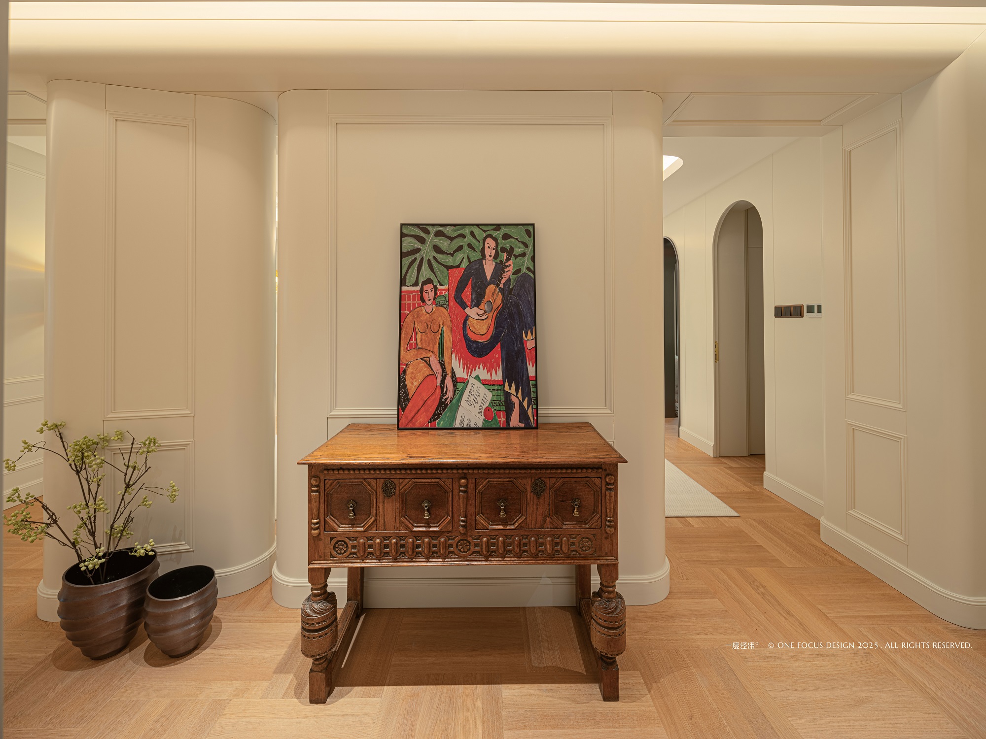 设计师正是从玄关处悬挂的这幅装饰画中汲取了色彩的灵感与韵律。墙面优雅流转的圆弧设计,柔化了原本生硬的墙角棱角,为空间注入灵动气息,更显开阔通透。