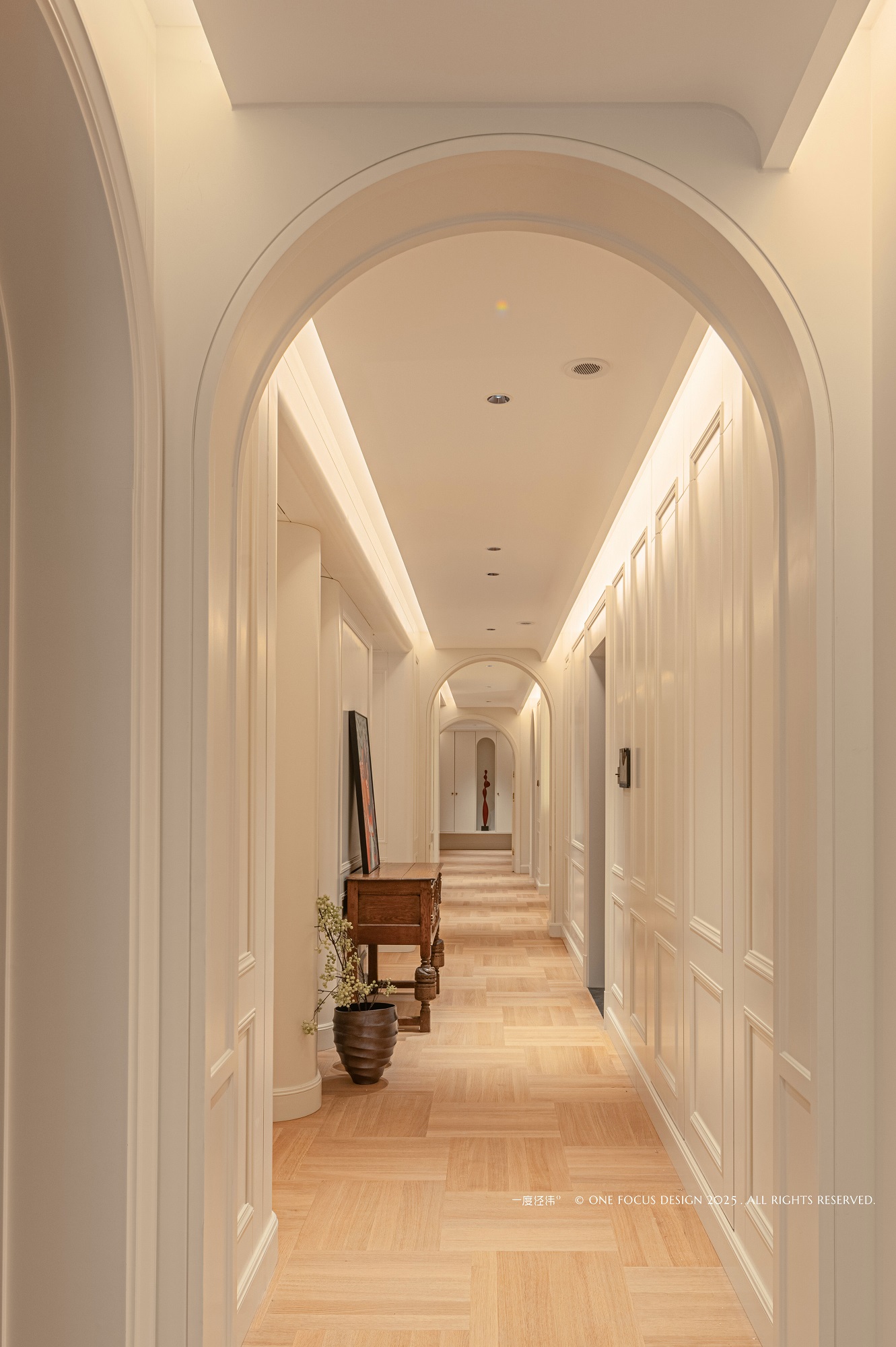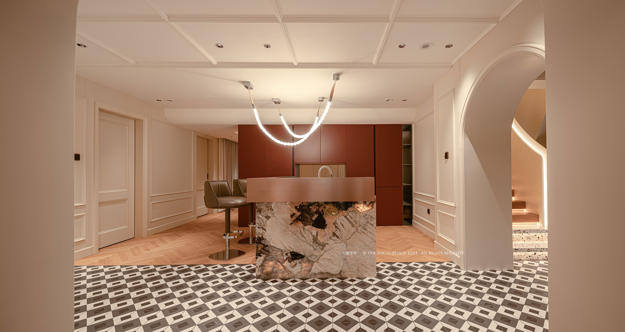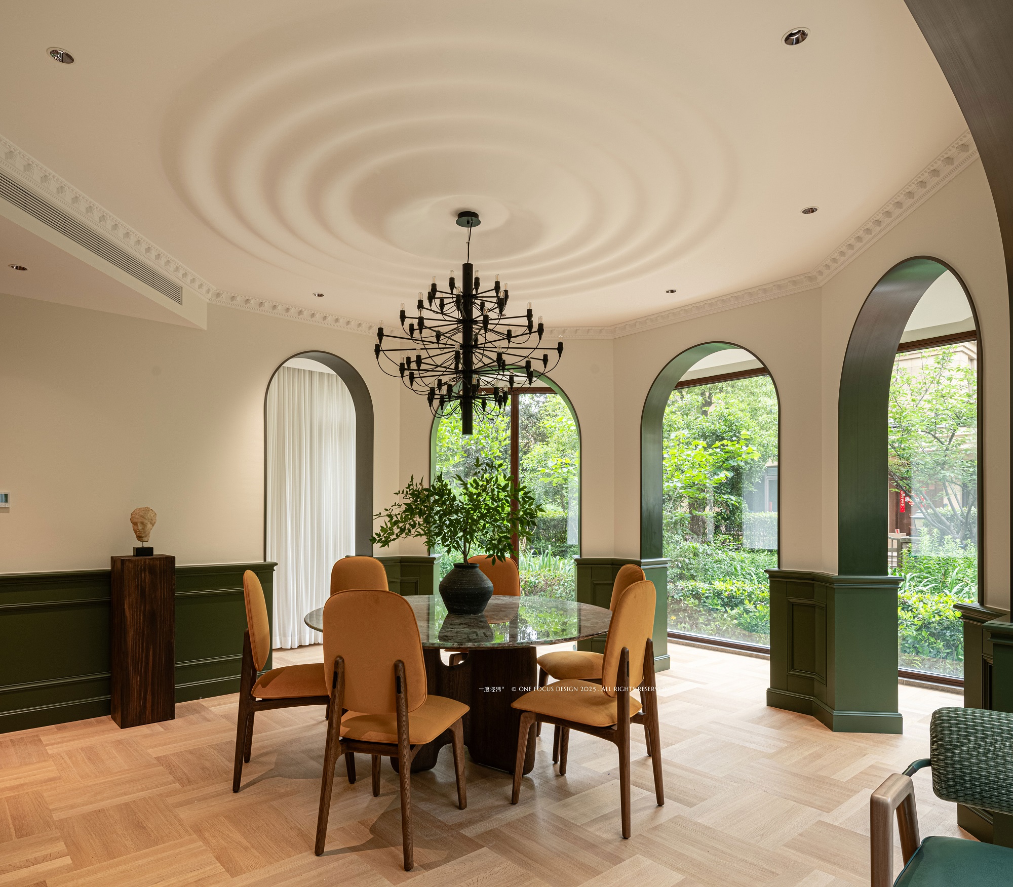 为呼应圆桌意象,餐厅顶部水波纹荡漾,金属吊灯与线条交织其间。 深色与白墙碰撞,弧形拱门流动,木地板的温润质感弥漫开来,柔化并统一了整个空间氛围。