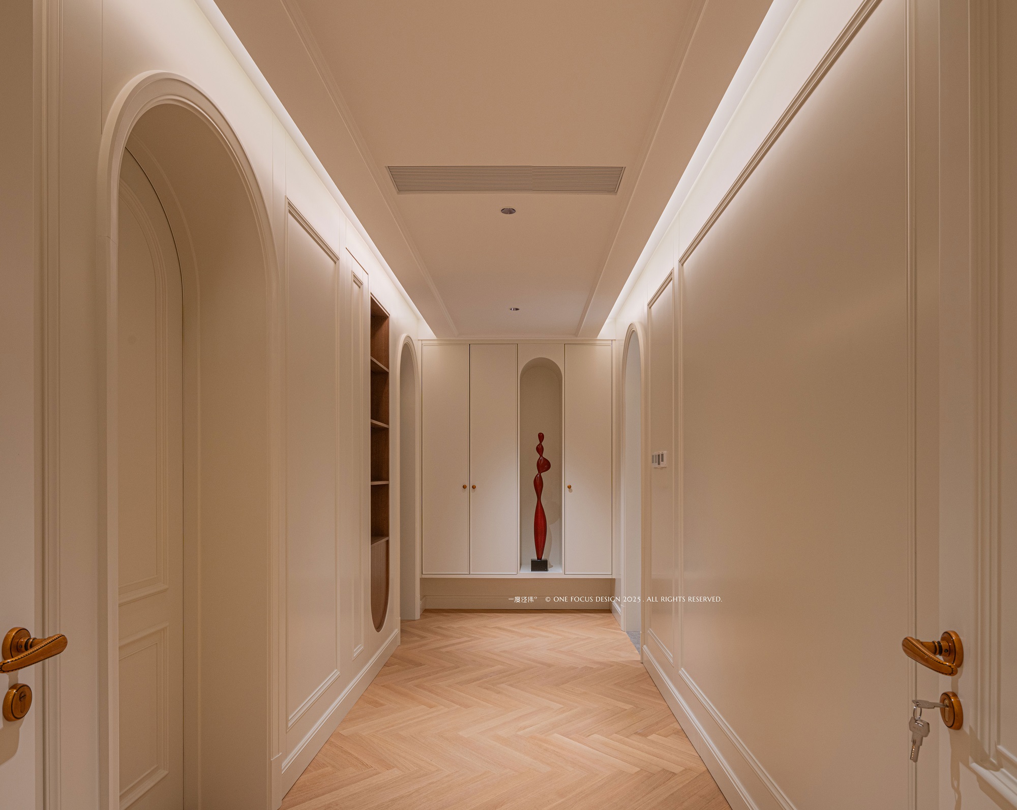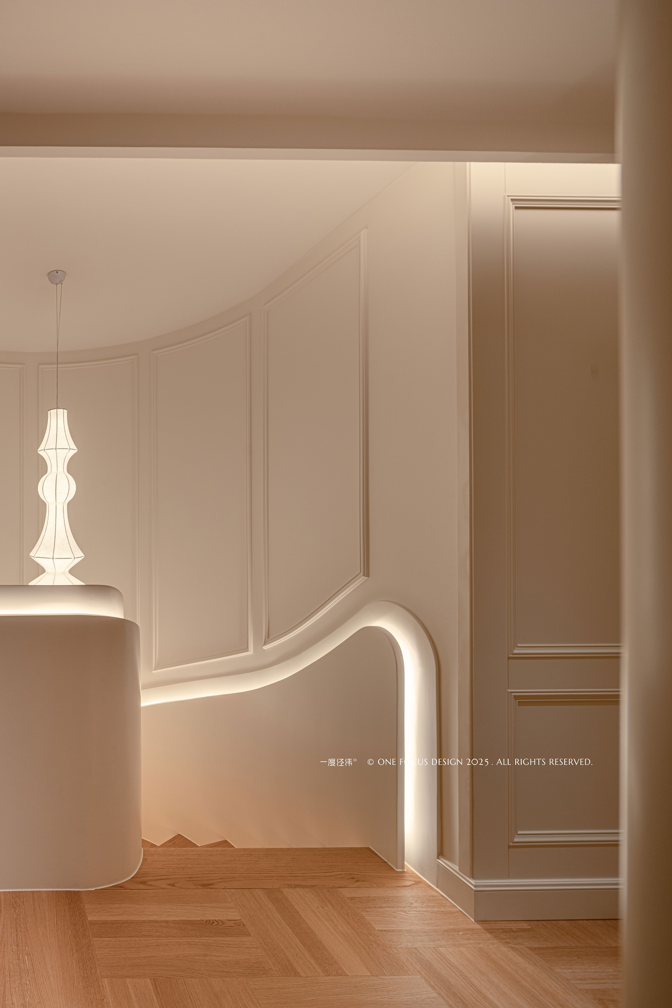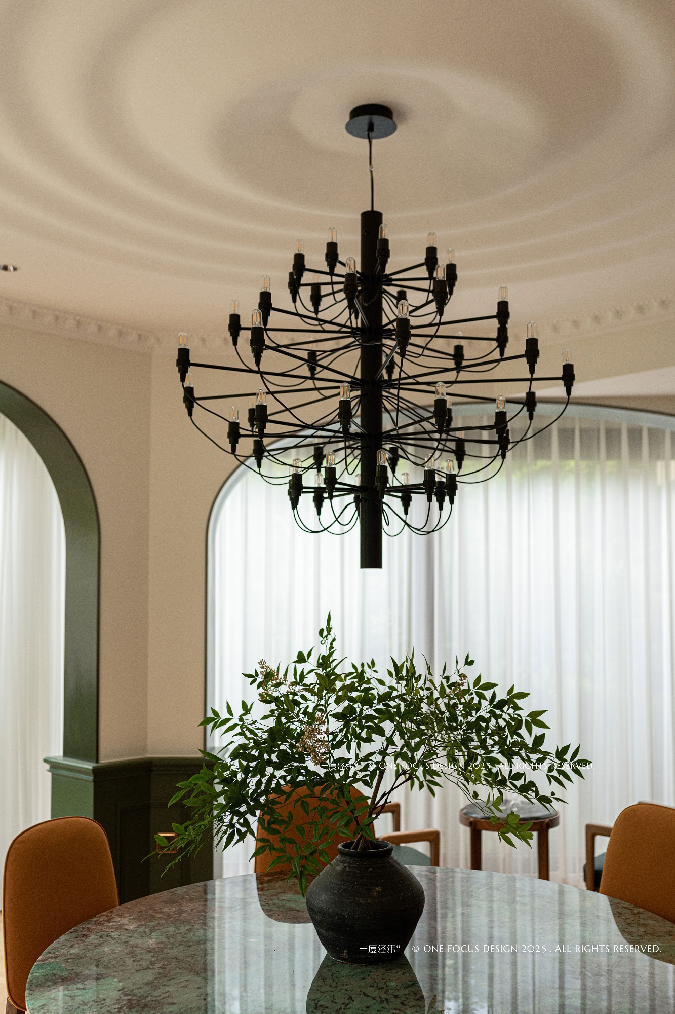 为呼应圆桌意象,餐厅顶部水波纹荡漾,金属吊灯与线条交织其间。 深色与白墙碰撞,弧形拱门流动,木地板的温润质感弥漫开来,柔化并统一了整个空间氛围。