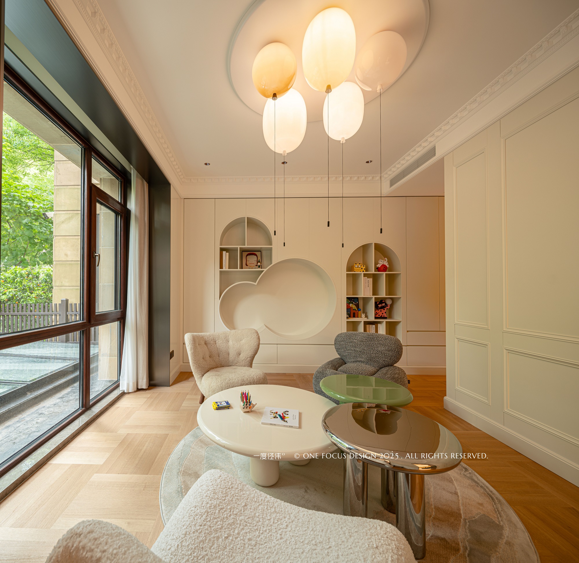 专为未来小主人预留的独立玩乐区, 以气球吊灯与云朵造型收纳柜点缀童趣。简洁利落的线条勾勒空间,营造出安全舒适的氛围,让这里成为孩子探索学习与快乐成长的专属天地。