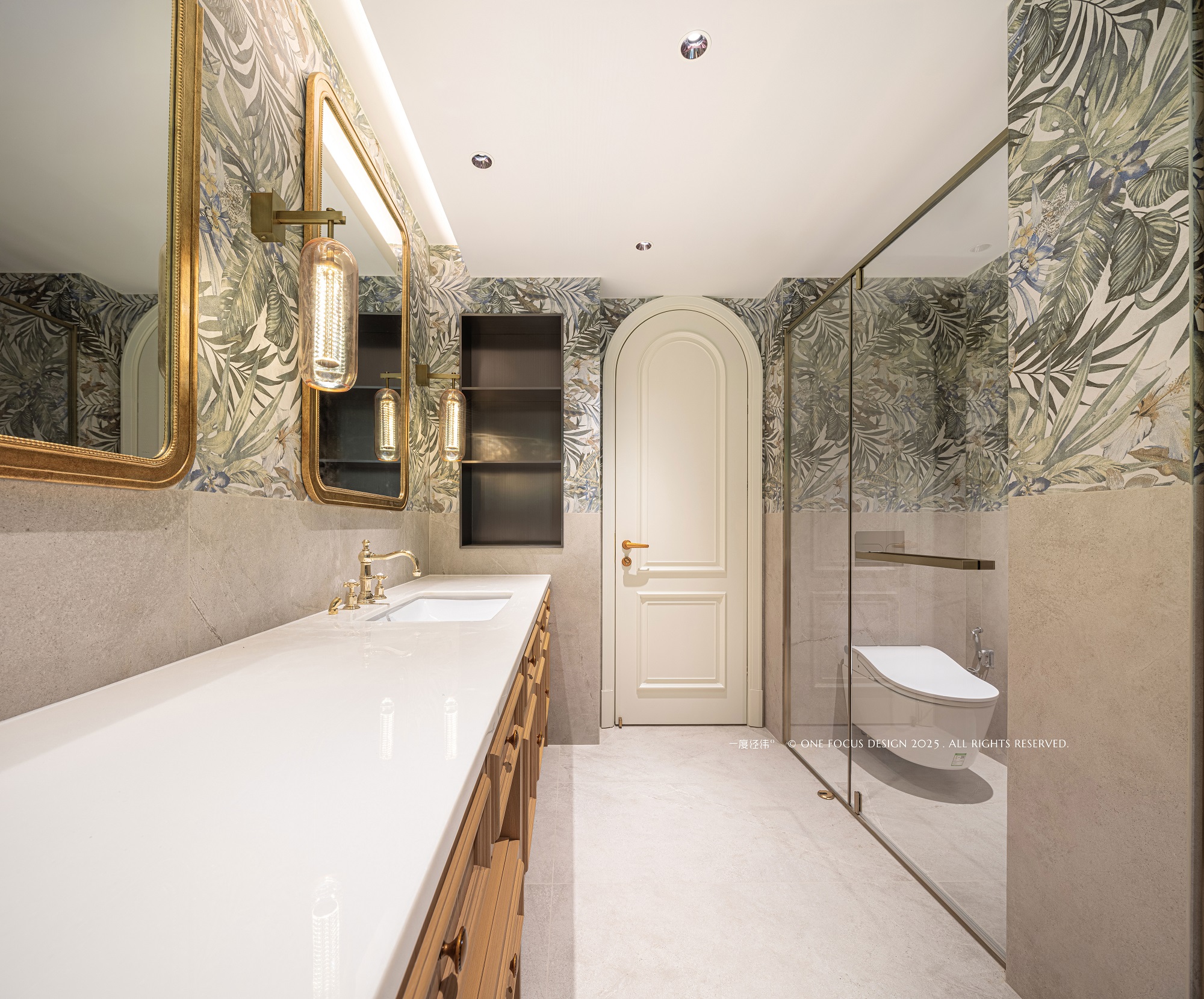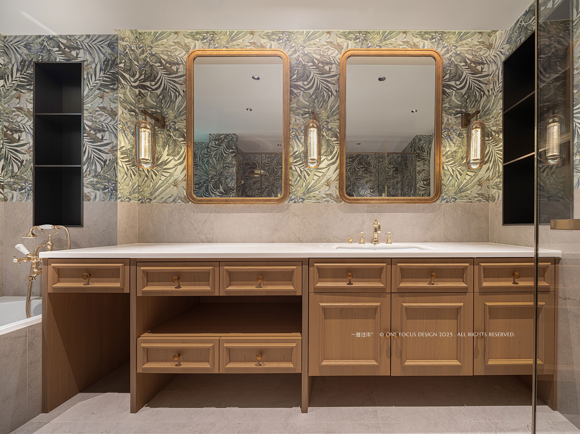 鎏金边框的古董镜映照时光,墙面内嵌的壁龛巧妙利用,兼顾实用与美感。复古做旧处理的木质浴室柜静立其间,以其温润质感与岁月痕迹,为空间注入诗意般的精致与慵懒浪漫。
