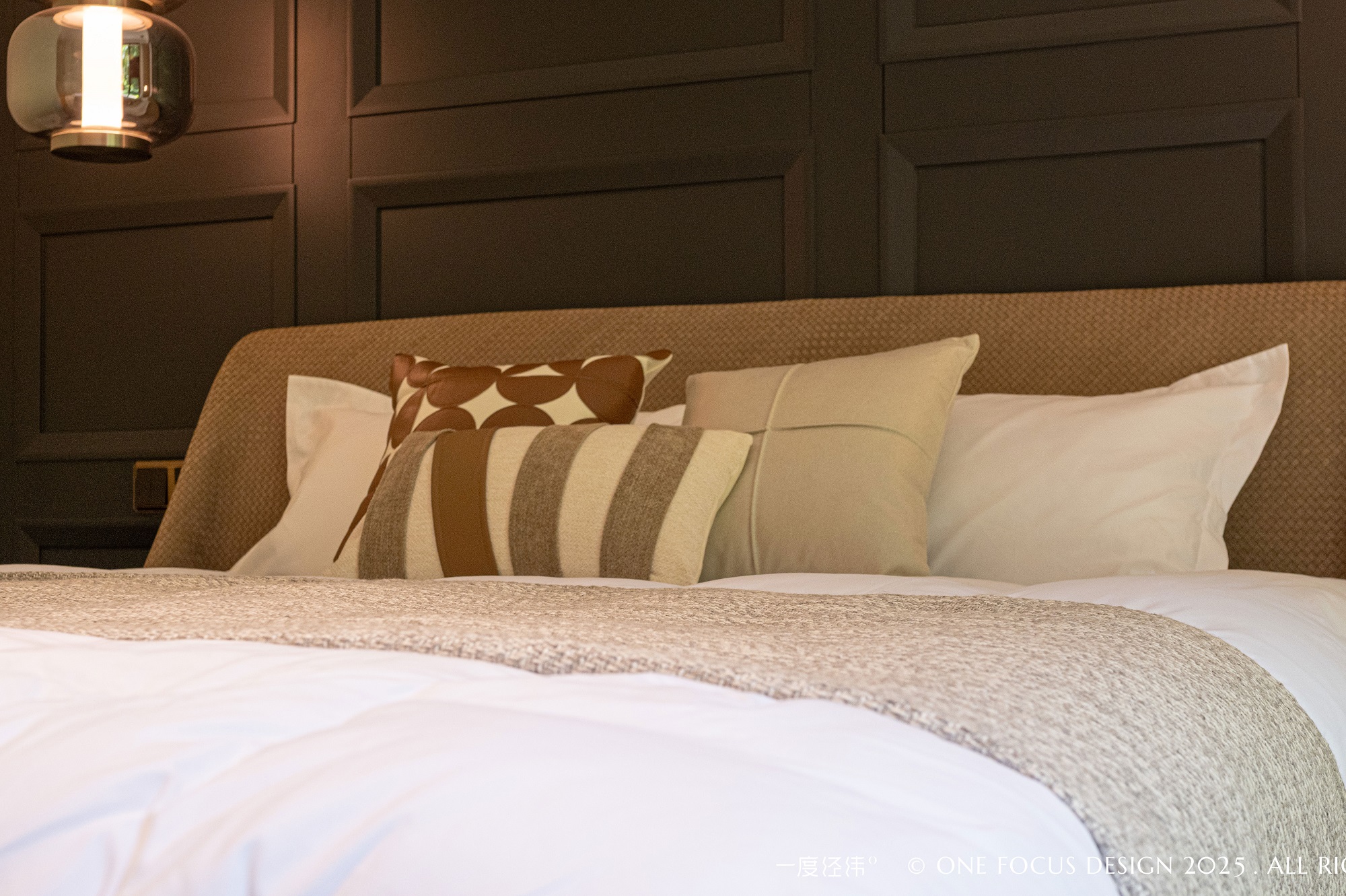 以深邃的深色为底,金属质感的床头灯勾勒出精致奢华的细节, 为客房平添一抹神秘气质。而当窗外的自然光流淌而入,瞬间消融了深色的厚重,空间随之焕发出轻盈通透的舒适感,沉稳与灵动在此和谐相生。