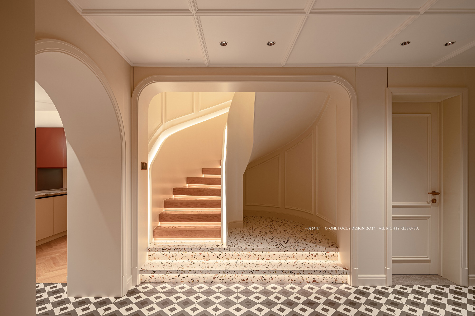 脚下,是永不落幕的黑白乐章——经典几何花砖铺陈开来,强烈的对比间沉淀着时光的韵味。视线随之向上,一道蜿蜒盘旋的楼梯优雅地延展,流畅的曲线如同凝固的音符,在空间里自在游走。