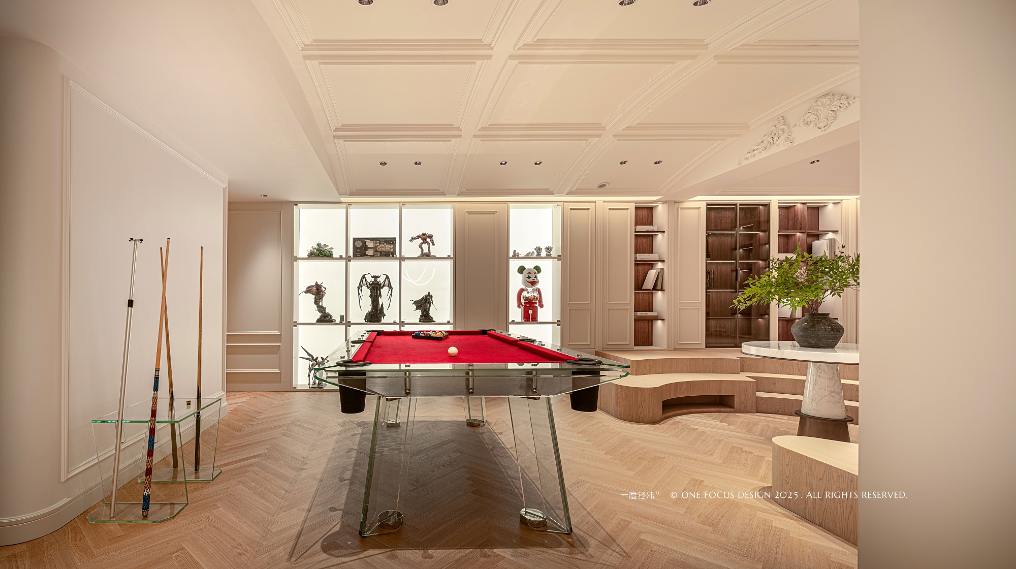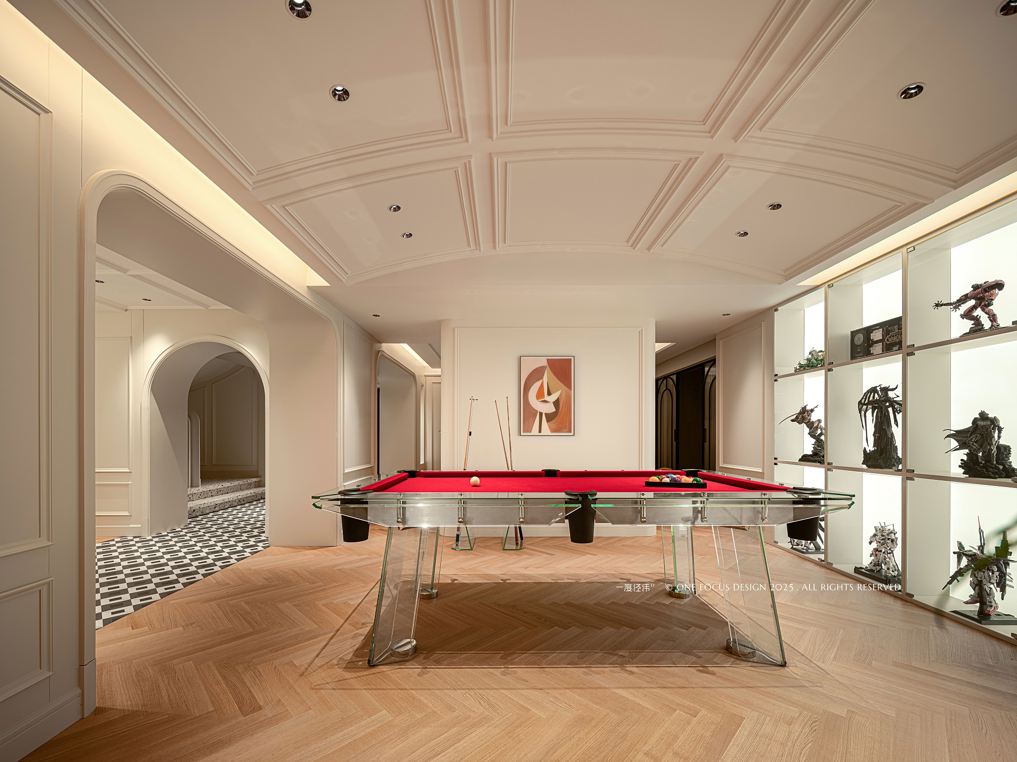 空间另一隅,化身为活力桌球区。 整面定制展柜如艺术画廊般,精心陈列着主人珍藏的手办,成为视觉焦点与个性宣言。