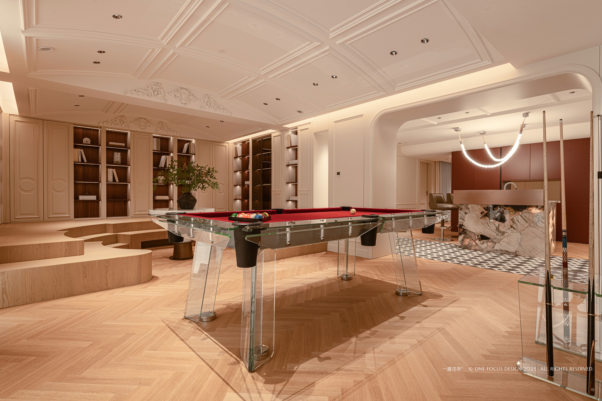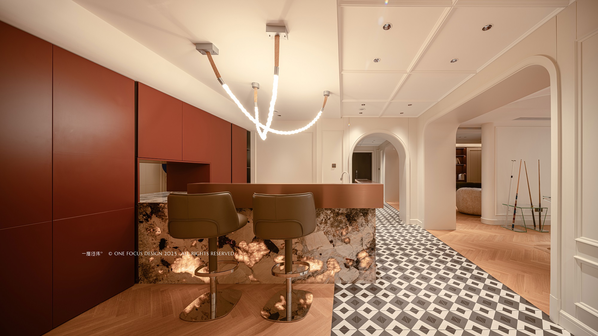 奢华吧台是日常待客的绝佳去处。酒红色的柜体沉稳雅致,上方悬挂的艺术吊灯洒下柔和光晕,光影交织间更显格调。