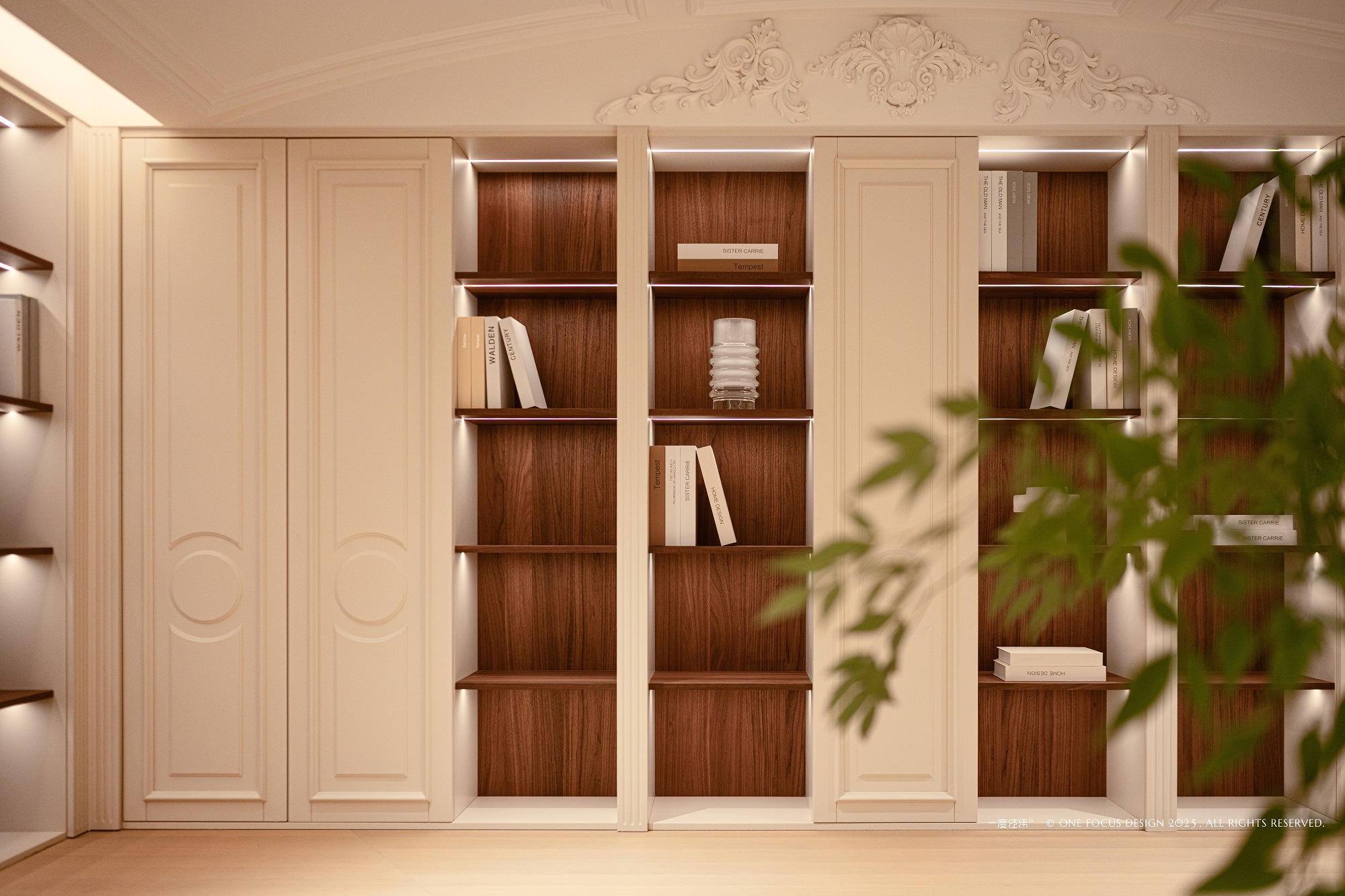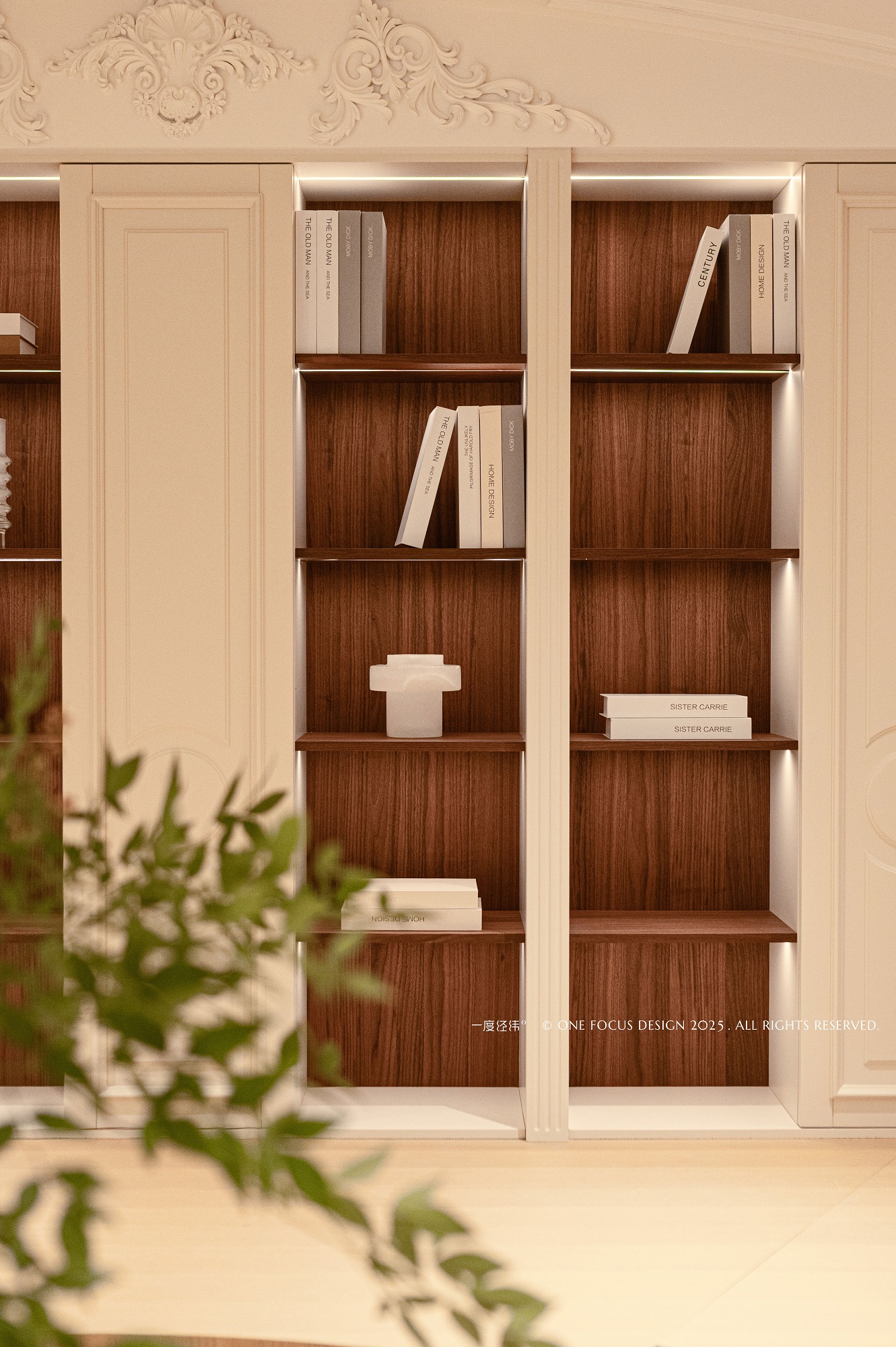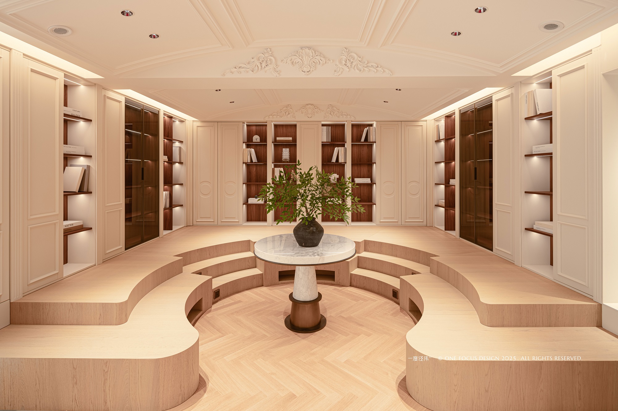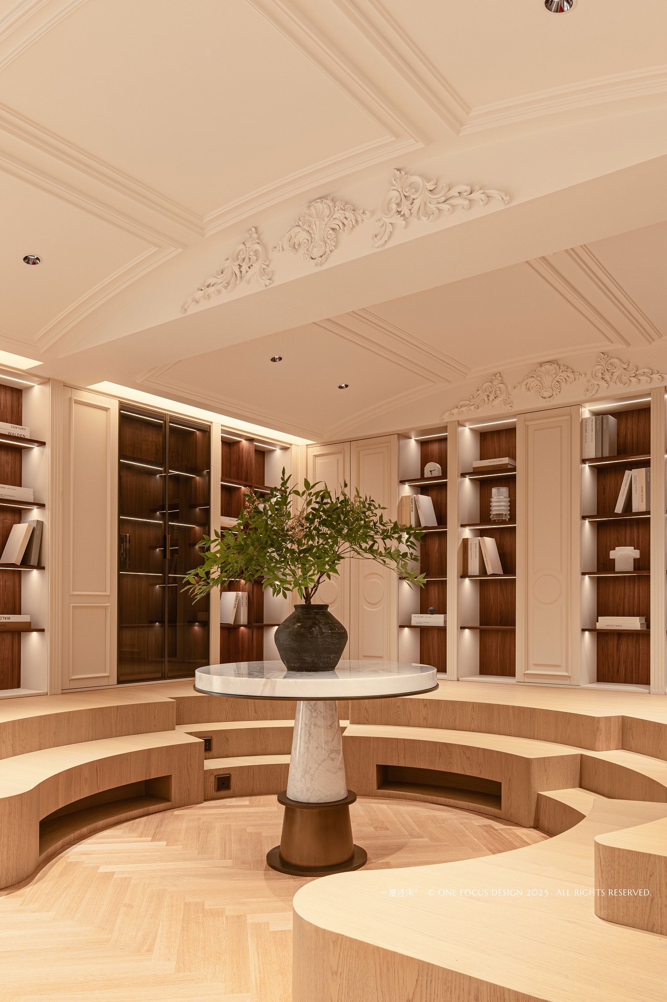 拾级而上的书架,以温暖的肌理拥抱整个空间,构筑起一座充满归属感的家庭图书馆。 书籍分门别类,整齐列队,静待指尖的翻阅与思想的遨游。