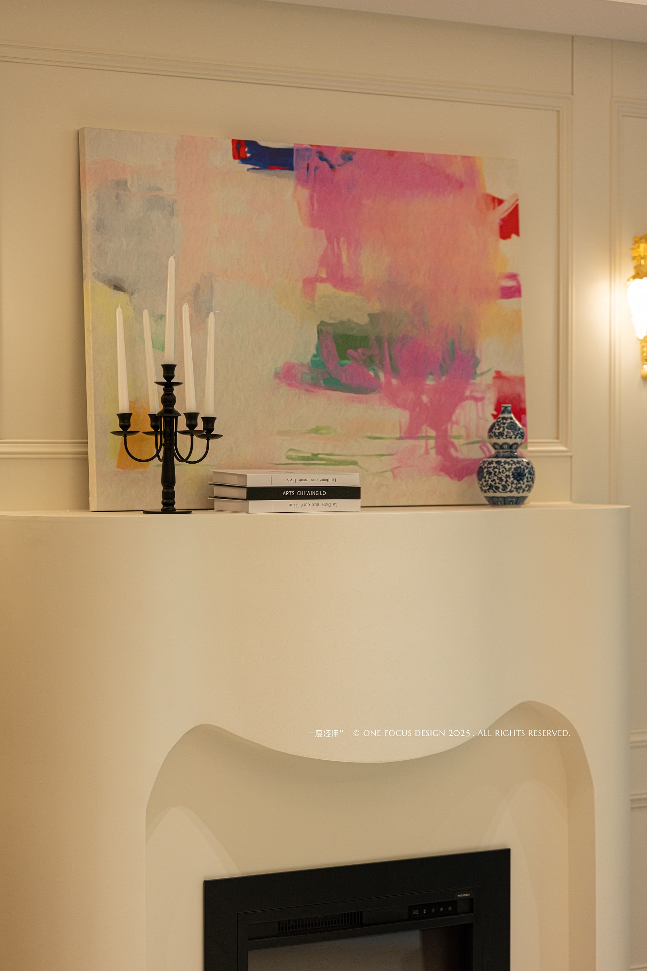 突破法式传统的框架,空间以精致的雕花饰面与灯盘为底蕴,缀以典雅奢华的金属质感吊灯。简洁的法式线条与流畅弧线交织,精巧的法式壁炉则为空间注入一抹别致的现代古典韵味。中式瓷器、复古烛台、摩登雕塑……多样元素在此和谐共生,共同演绎舒适宜人的客厅美学。