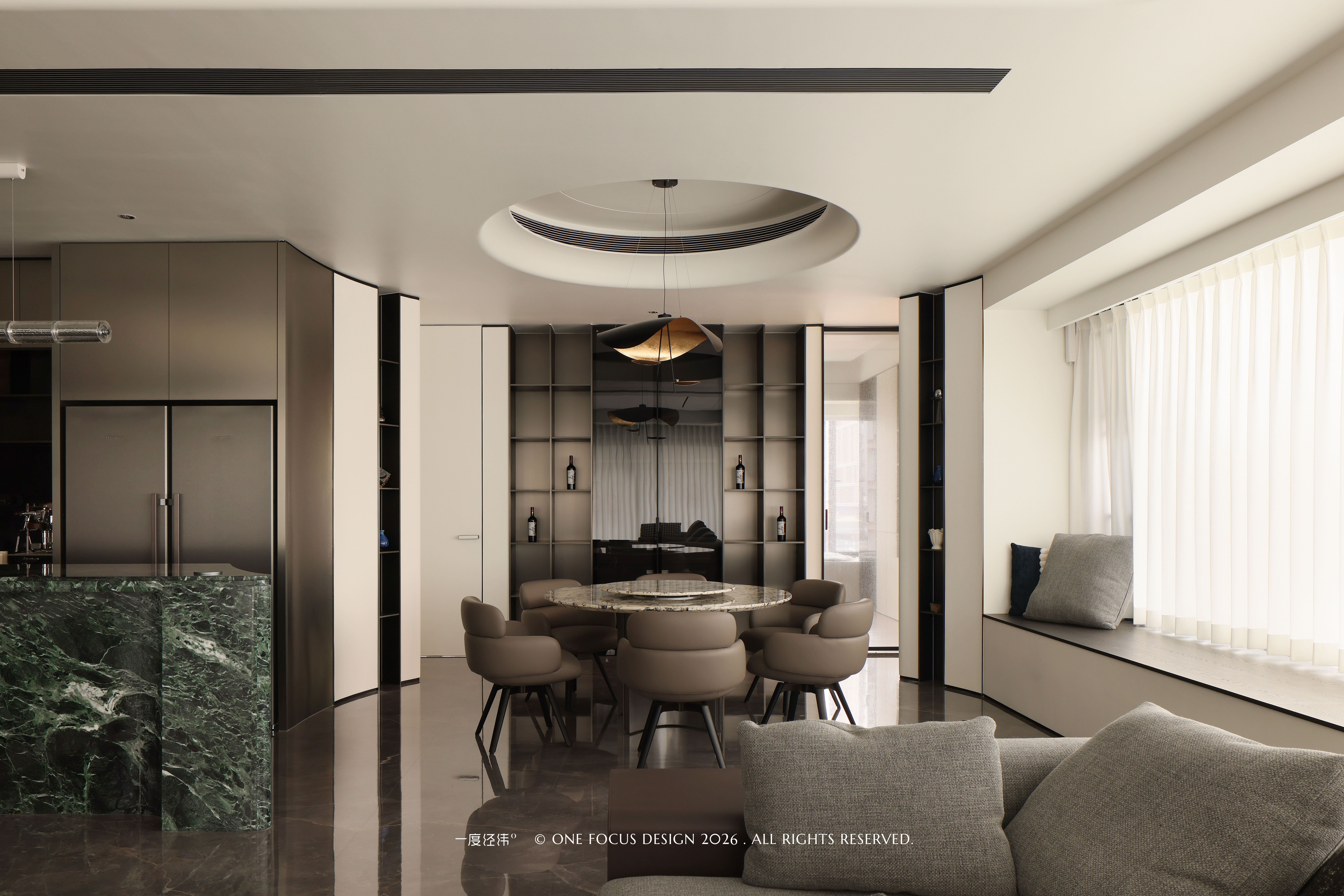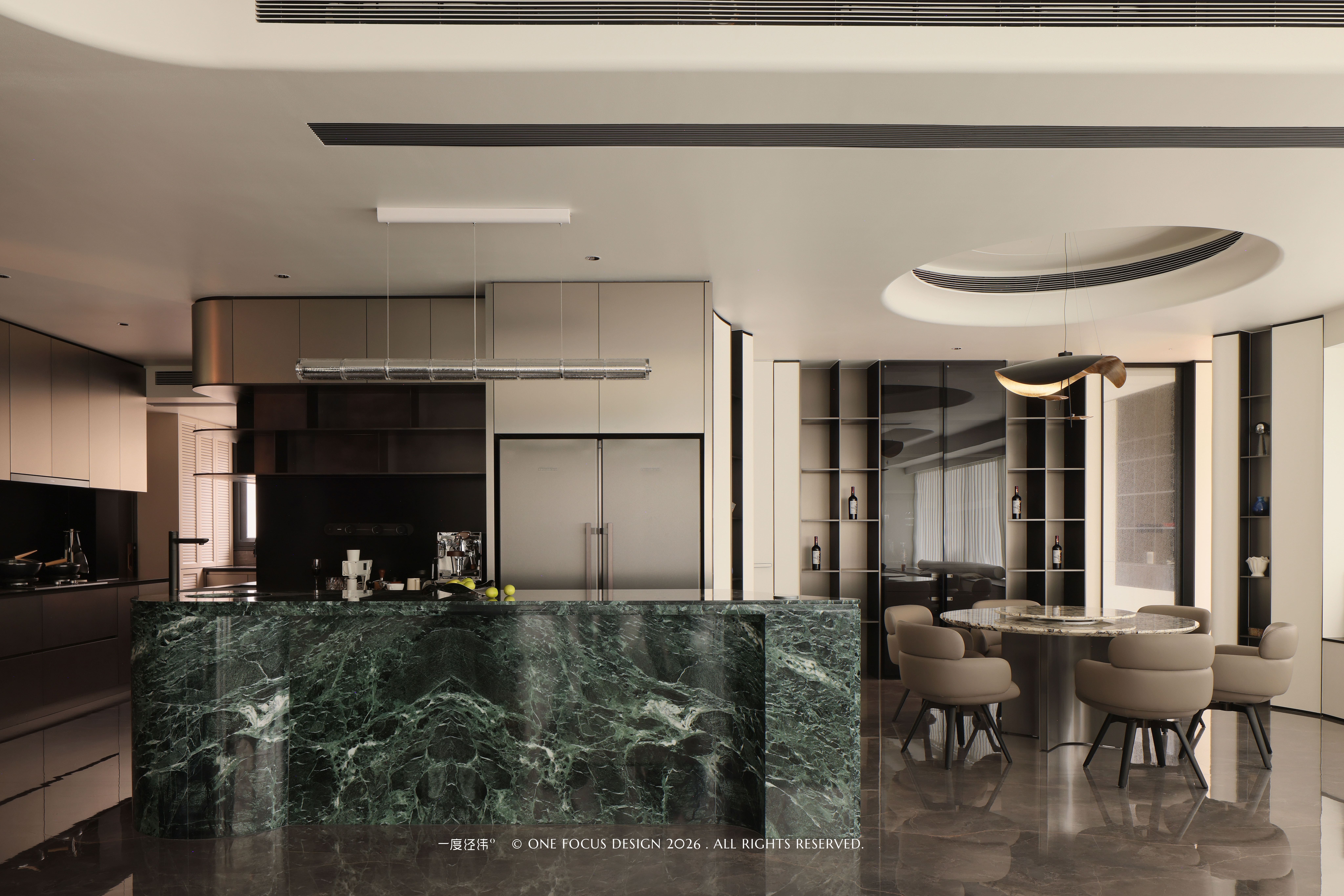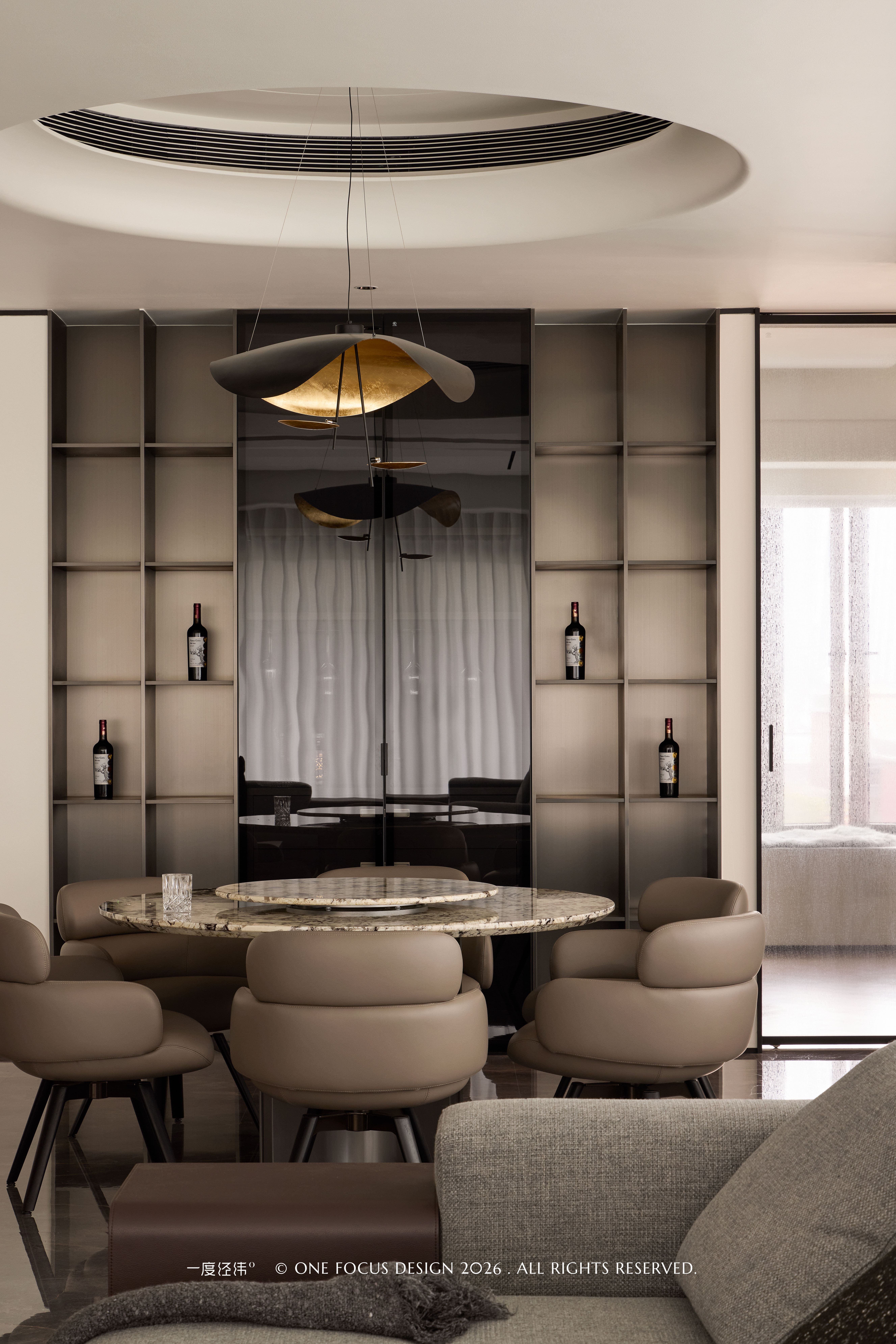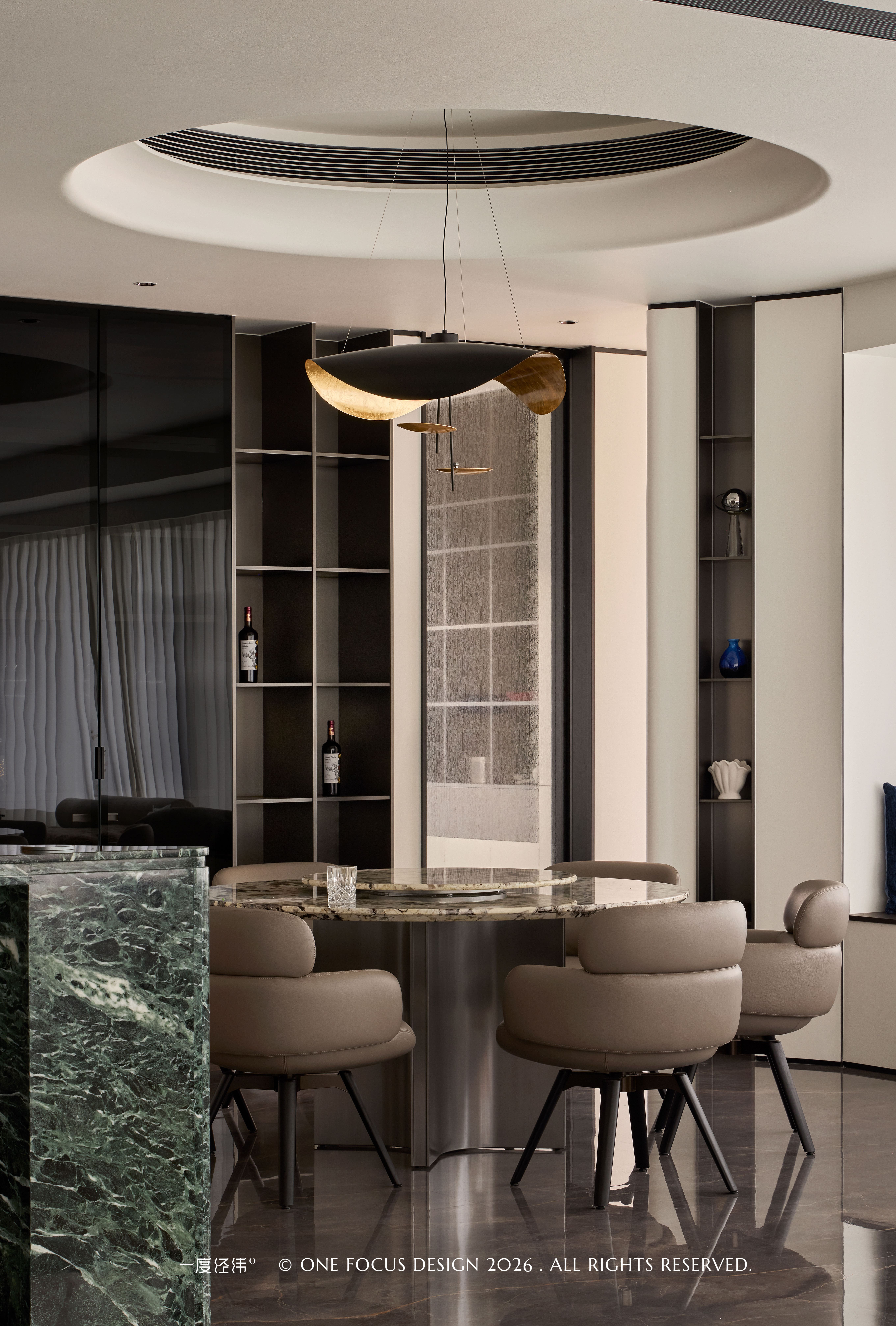 餐厅以圆形为核心,天然大理石餐台与浅咖色皮质座椅相得益彰,温润触感与冷冽石纹形成细腻对话。我们充分利用墙体打造一体化展示柜,平整利落的线条在视觉上延伸了空间,实现了收纳与展示的平衡,珍藏佳酿陈列其间,为空间注入品质感与故事感。当光线漫过金属肌理,与圆形吊顶的线性灯带交相辉映,既柔化了空间棱角,又为用餐场景赋予了艺术化的仪式感,让每一餐都成为兼具美学与温度的生活仪式。