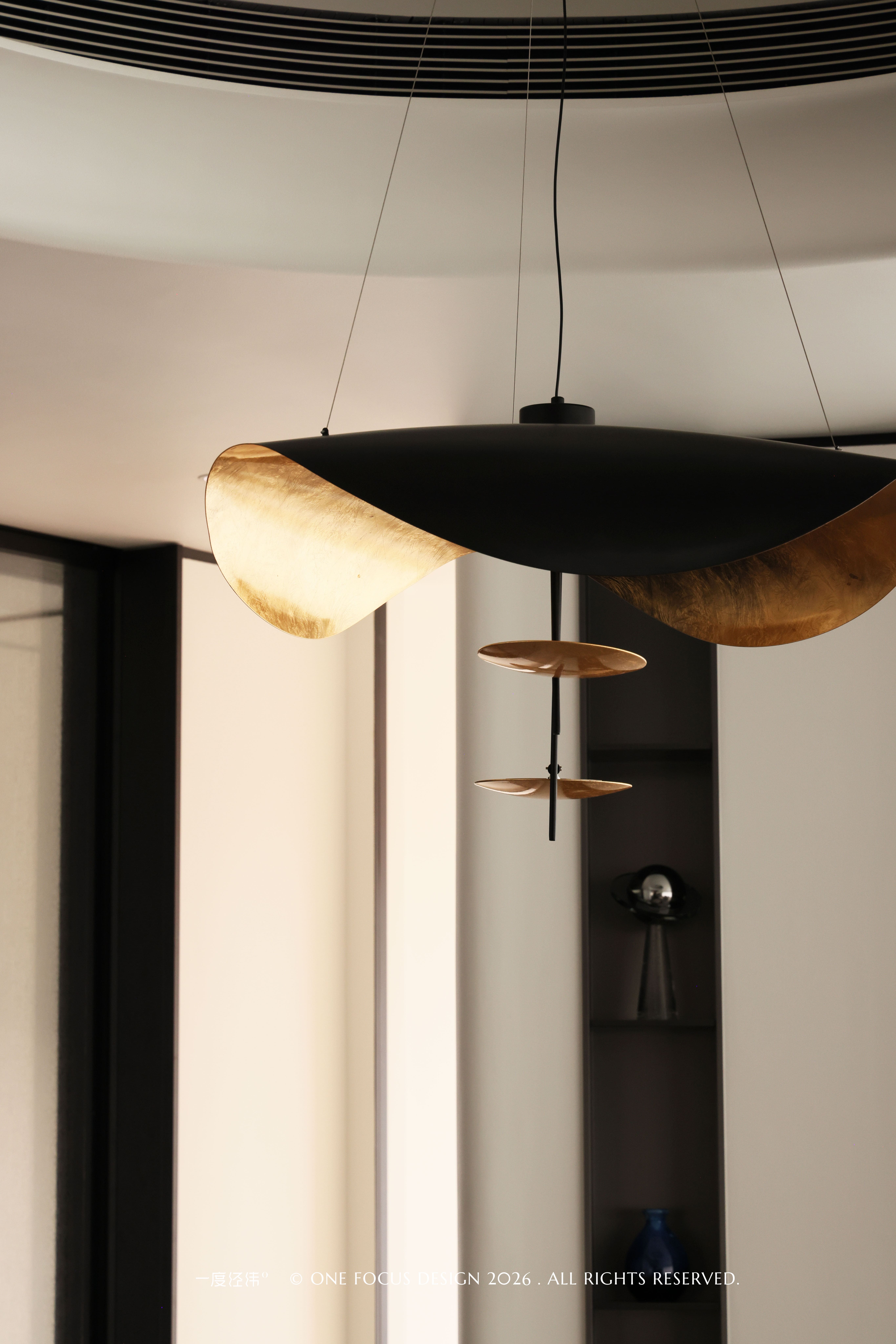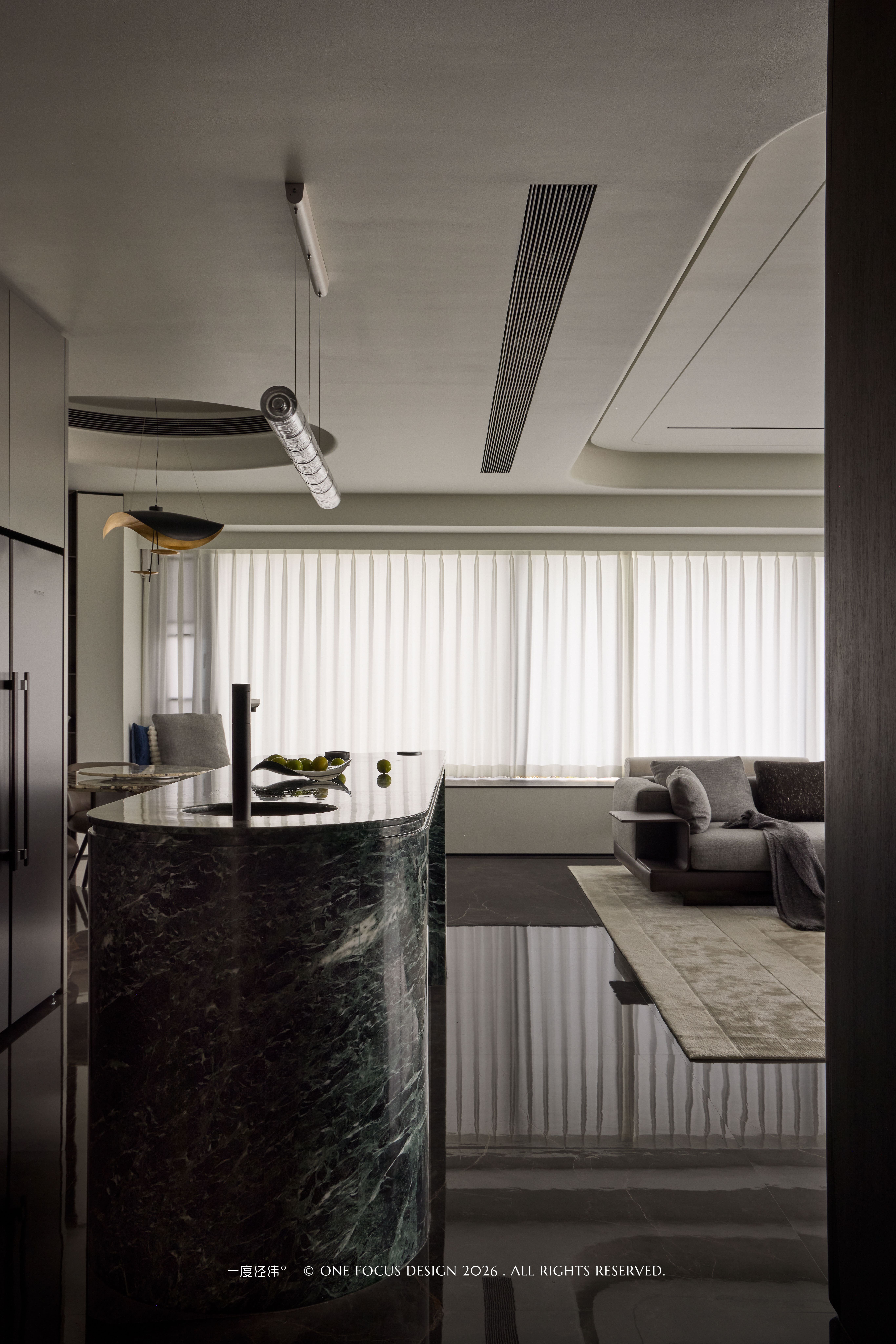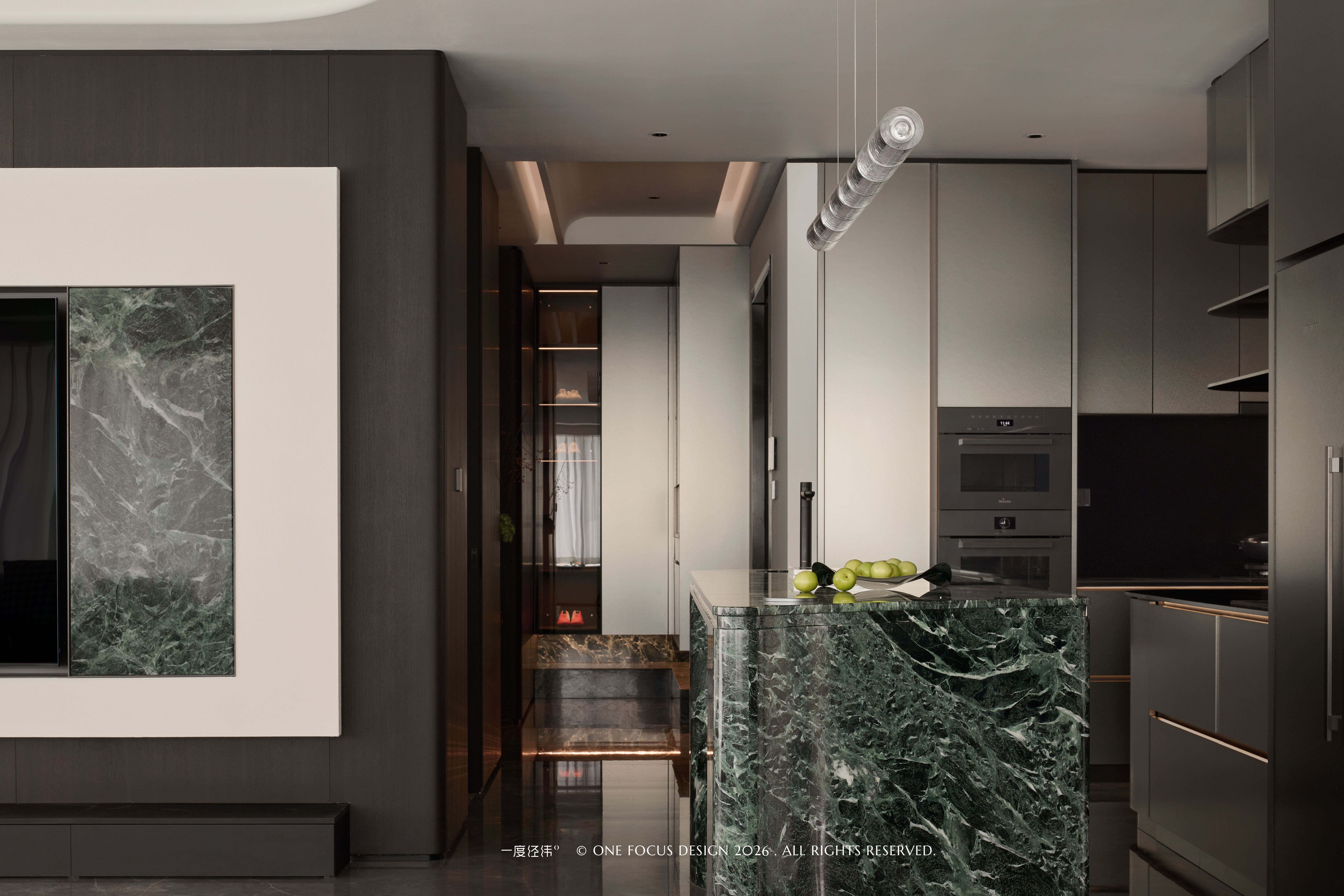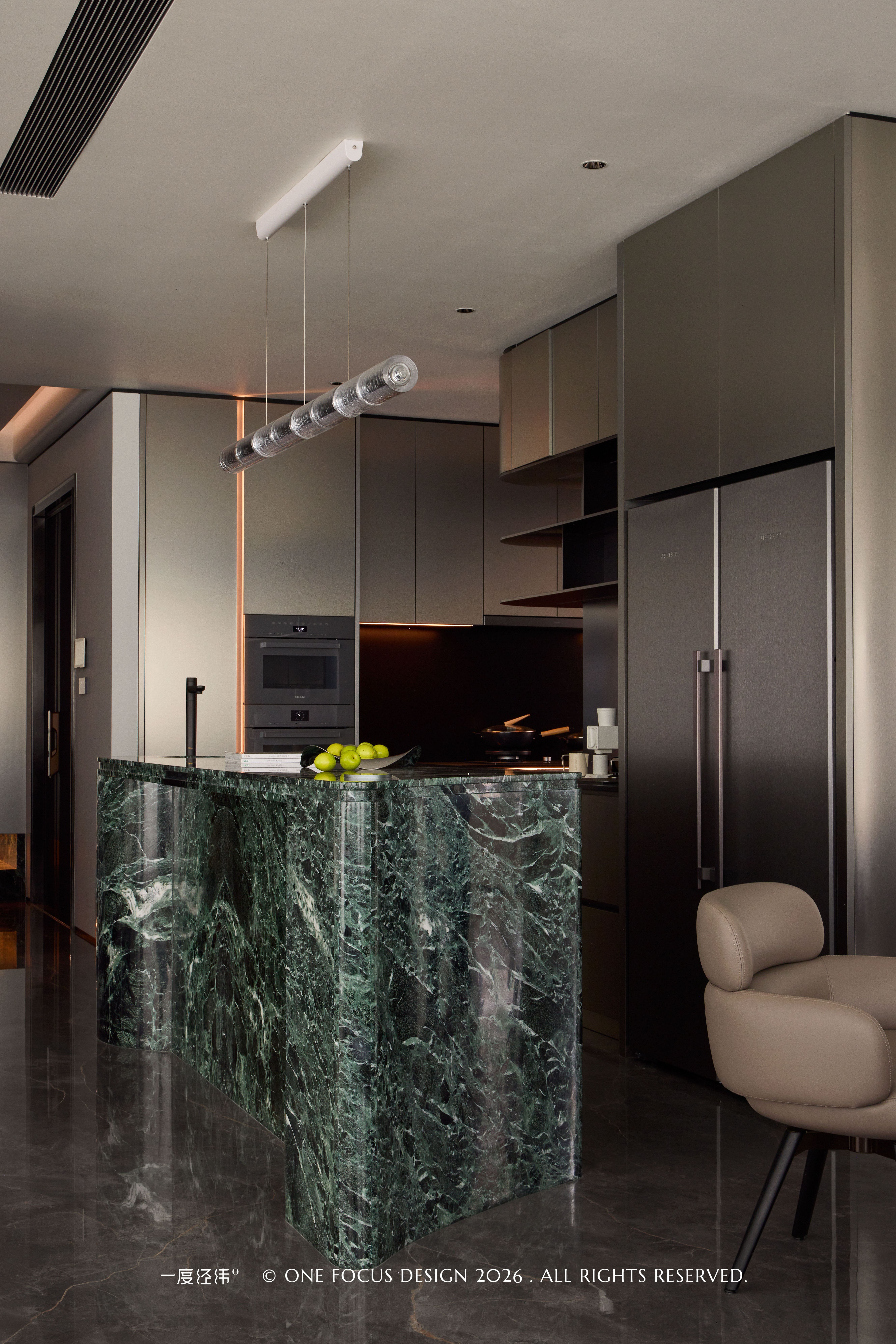 光线透过手工玻璃时,会在空间中投射出独特的水波纹路,让照明从功能升华为空间艺术:与冷翡翠大理石岛台的纹理形成呼应。