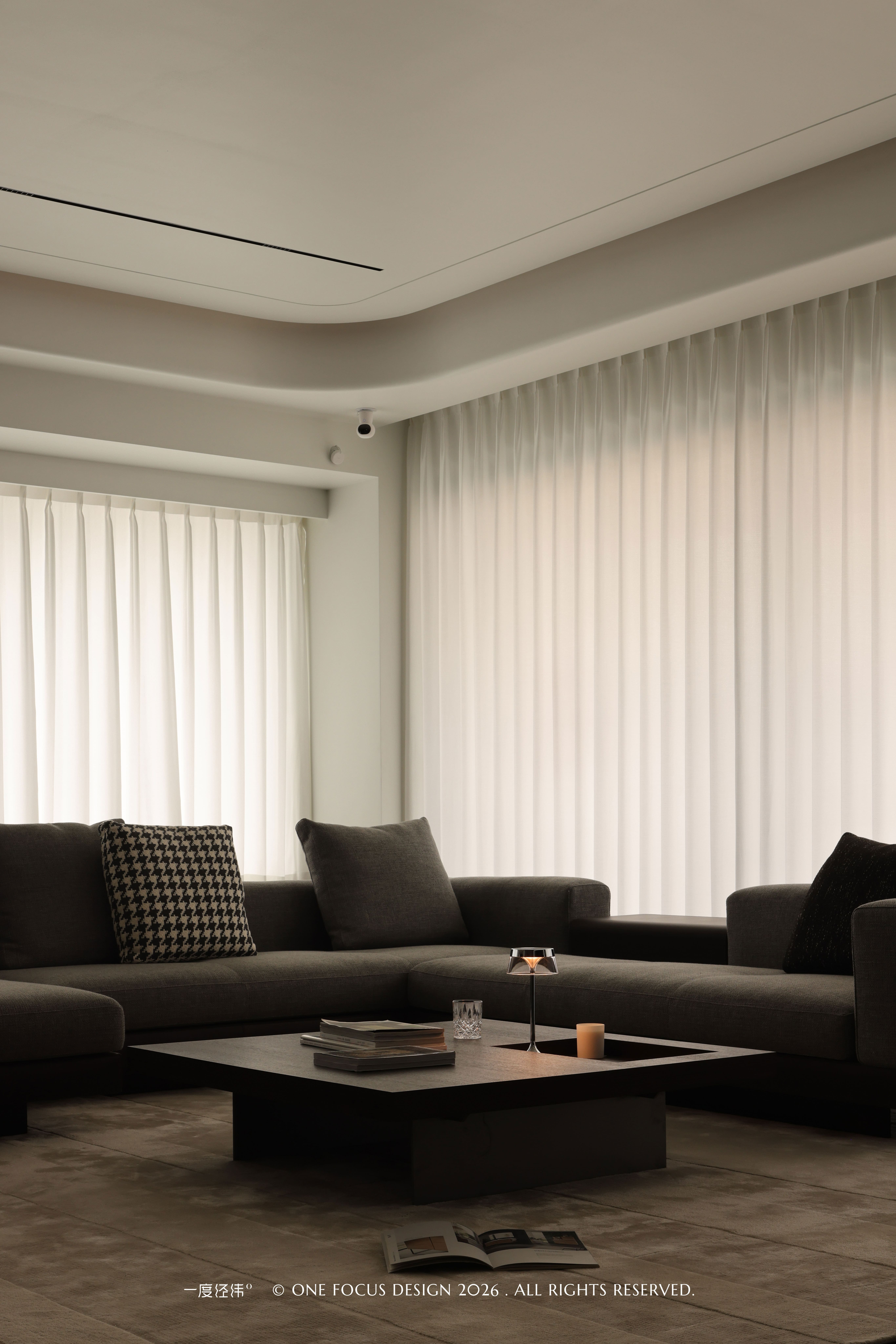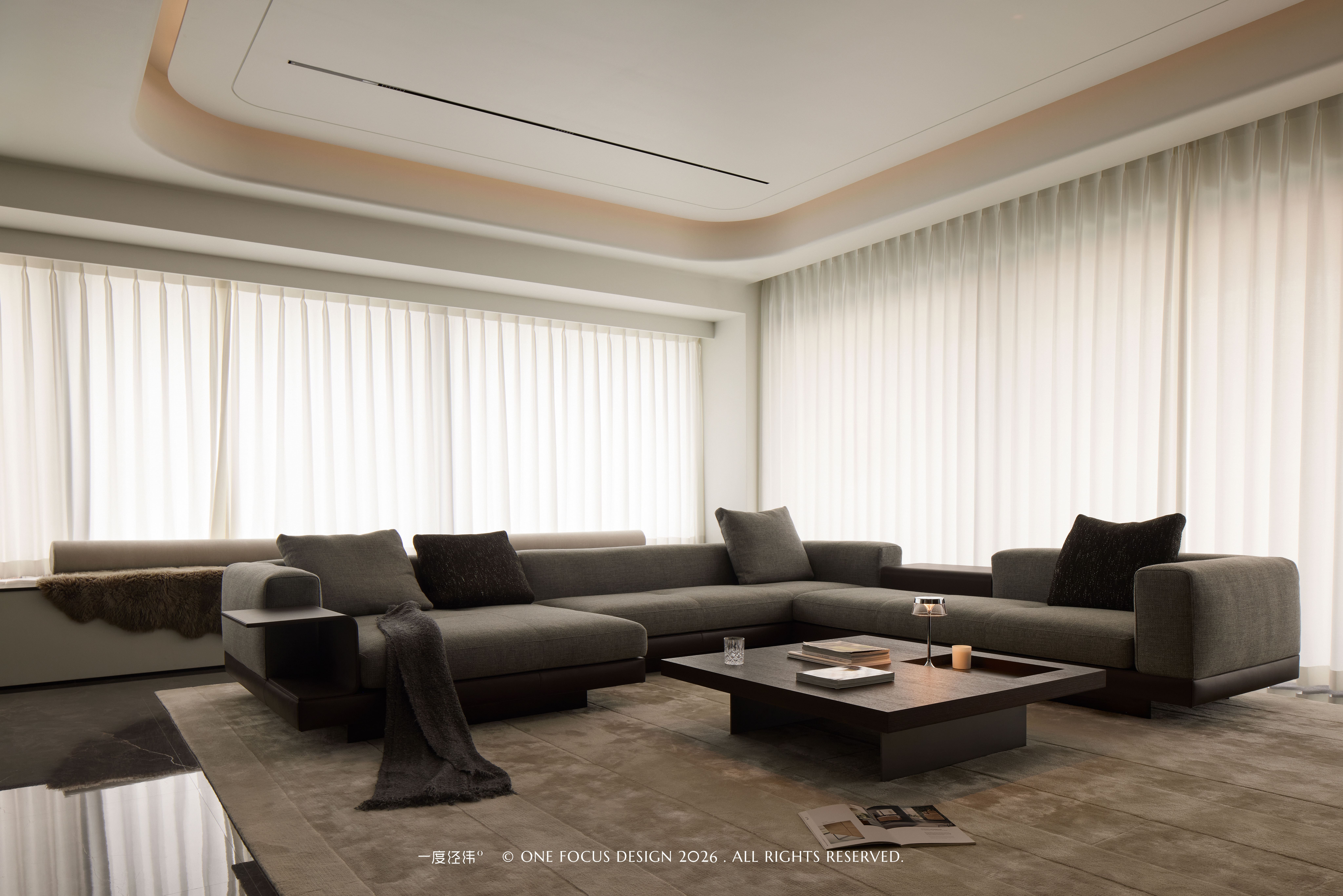 整面白色纱帘过滤了外界喧嚣,自然光柔和漫入,与顶部圆弧吊顶的线性灯带、嵌入式筒灯交相辉映,营造出静谧通透的休憩氛围。流畅的洄游动线让客厅与餐厨区自然衔接,打破了空间边界,让家人互动更显从容自在。