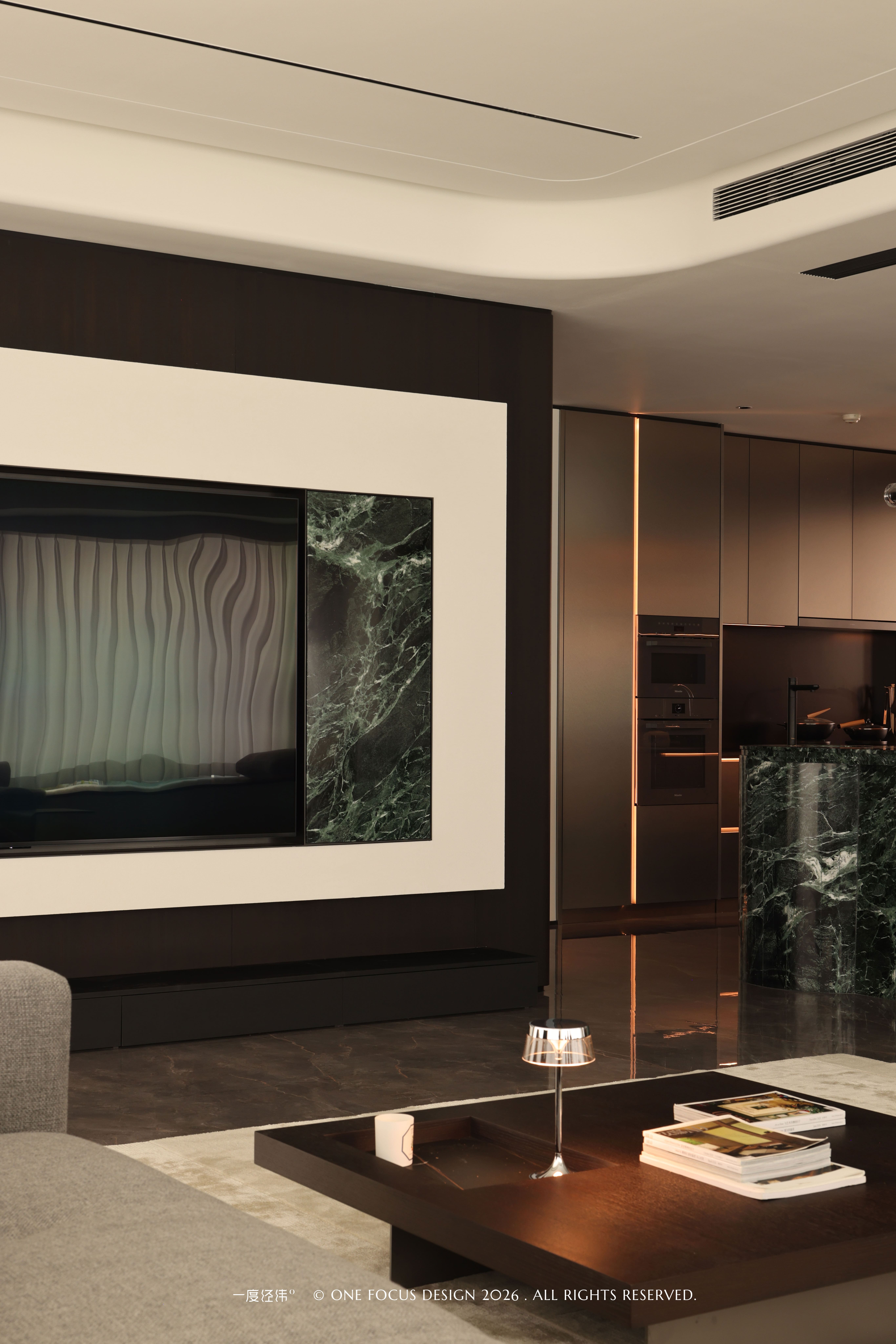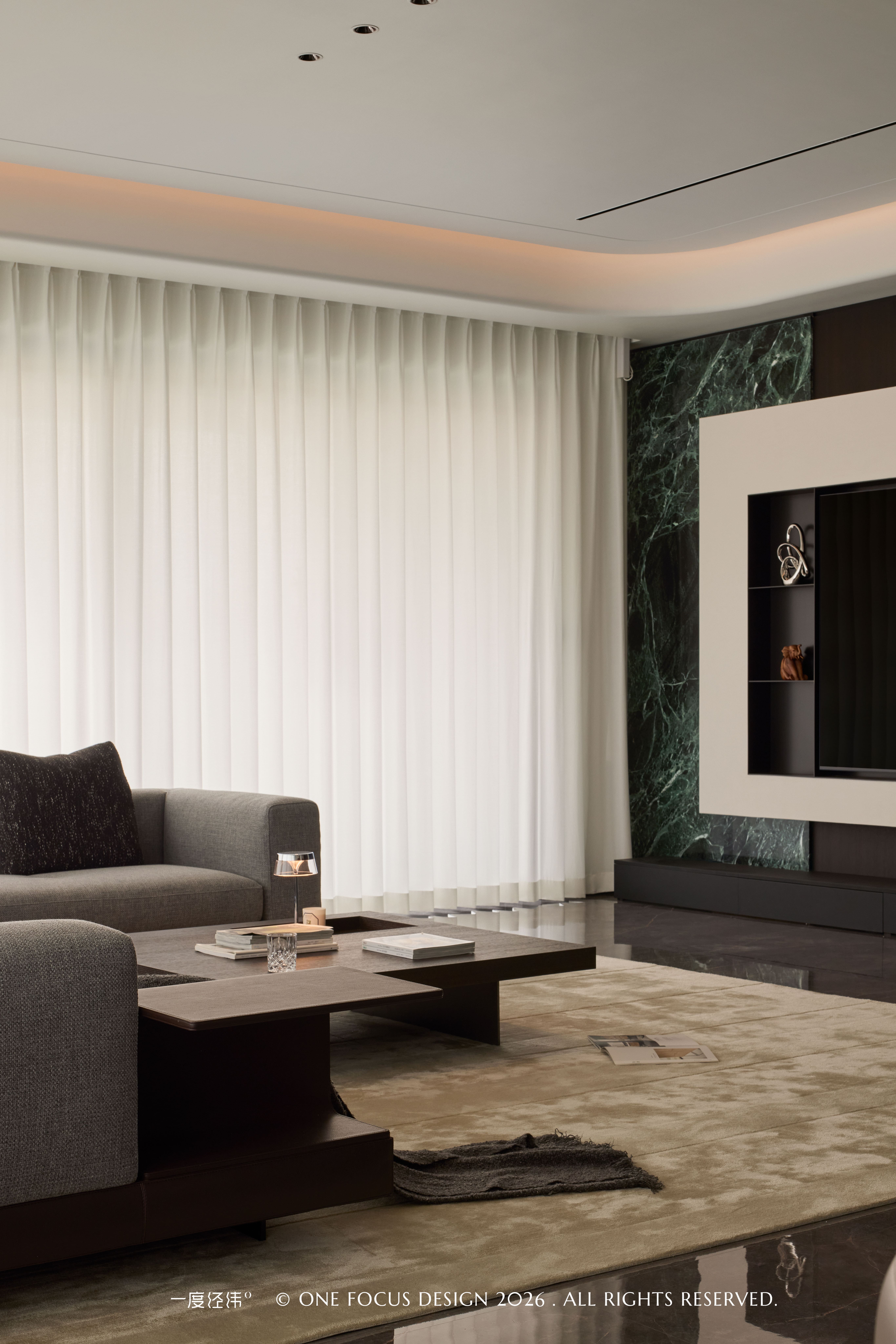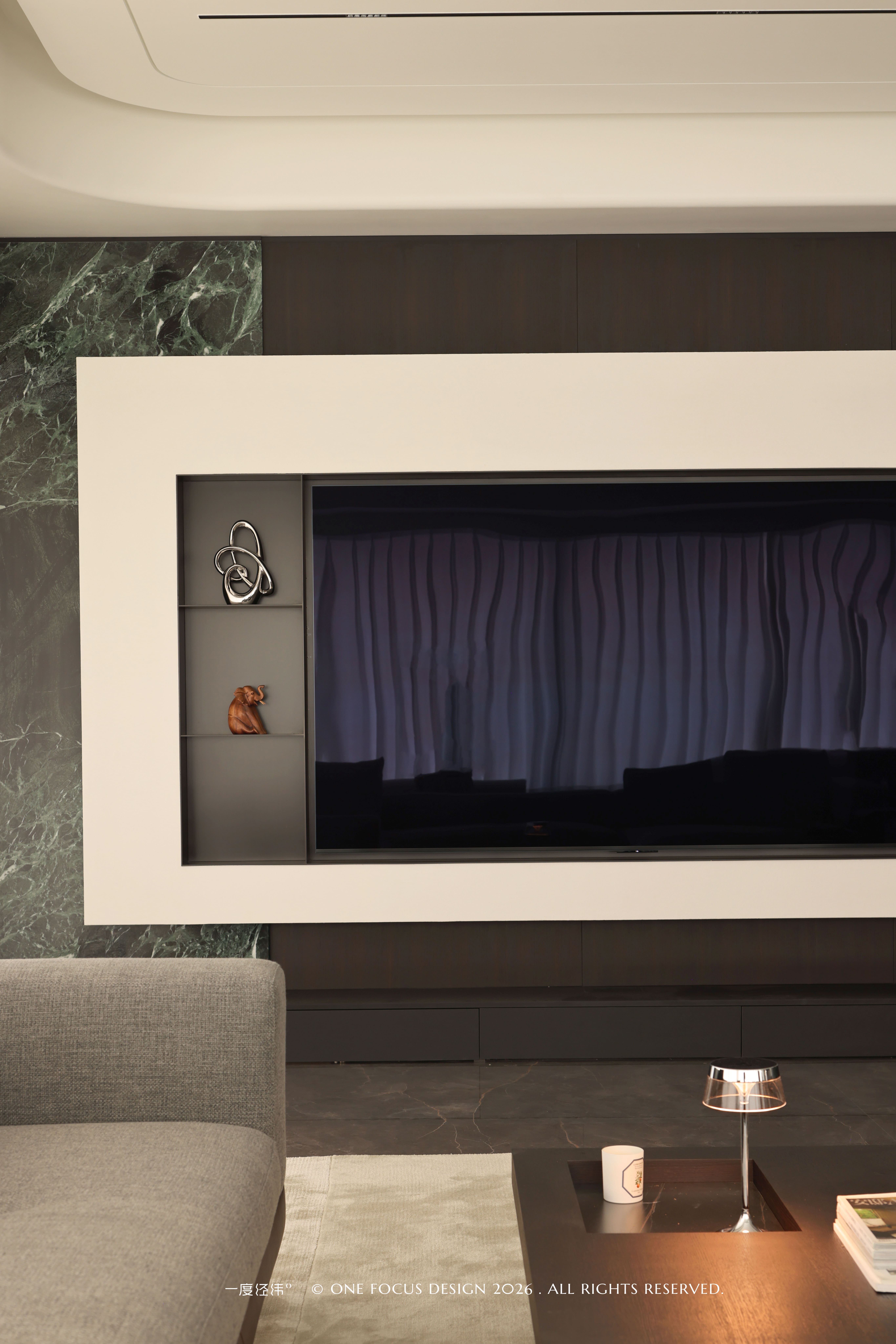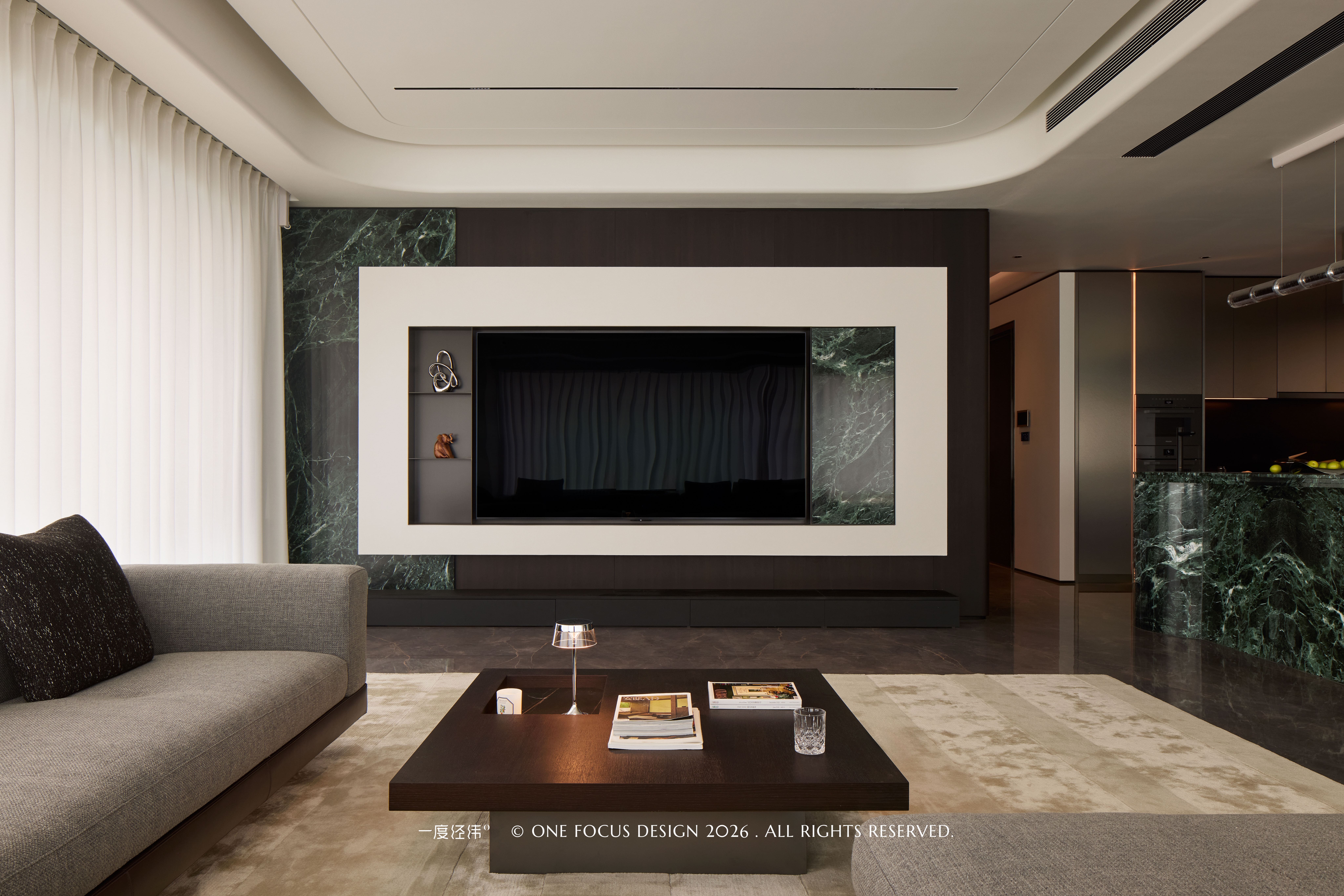 冷翡翠大理石电视背景墙与深木饰面形成强烈对比,流动的石纹与温润的木色相互映衬,浅灰色沙发与深色大理石茶几相得益彰,柔软的触感与冷冽的石纹碰撞出细腻的质感层次。