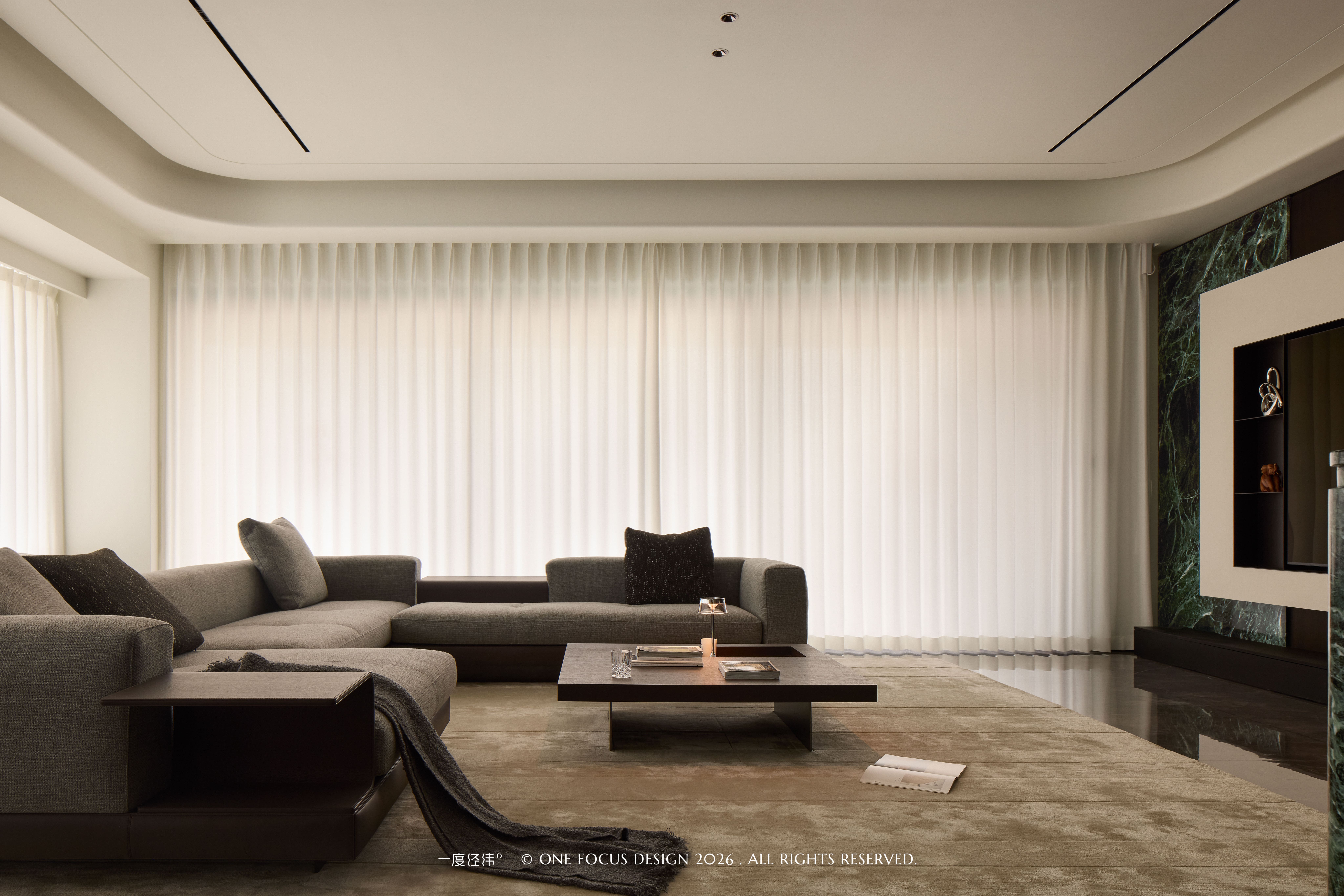 客厅与厨房、餐厅自然衔接,打破了传统空间的封闭感,形成流畅的洄游动线。整面的白色纱帘过滤了外界的喧嚣,让自然光柔和地漫入室内,营造出静谧而通透的氛围。