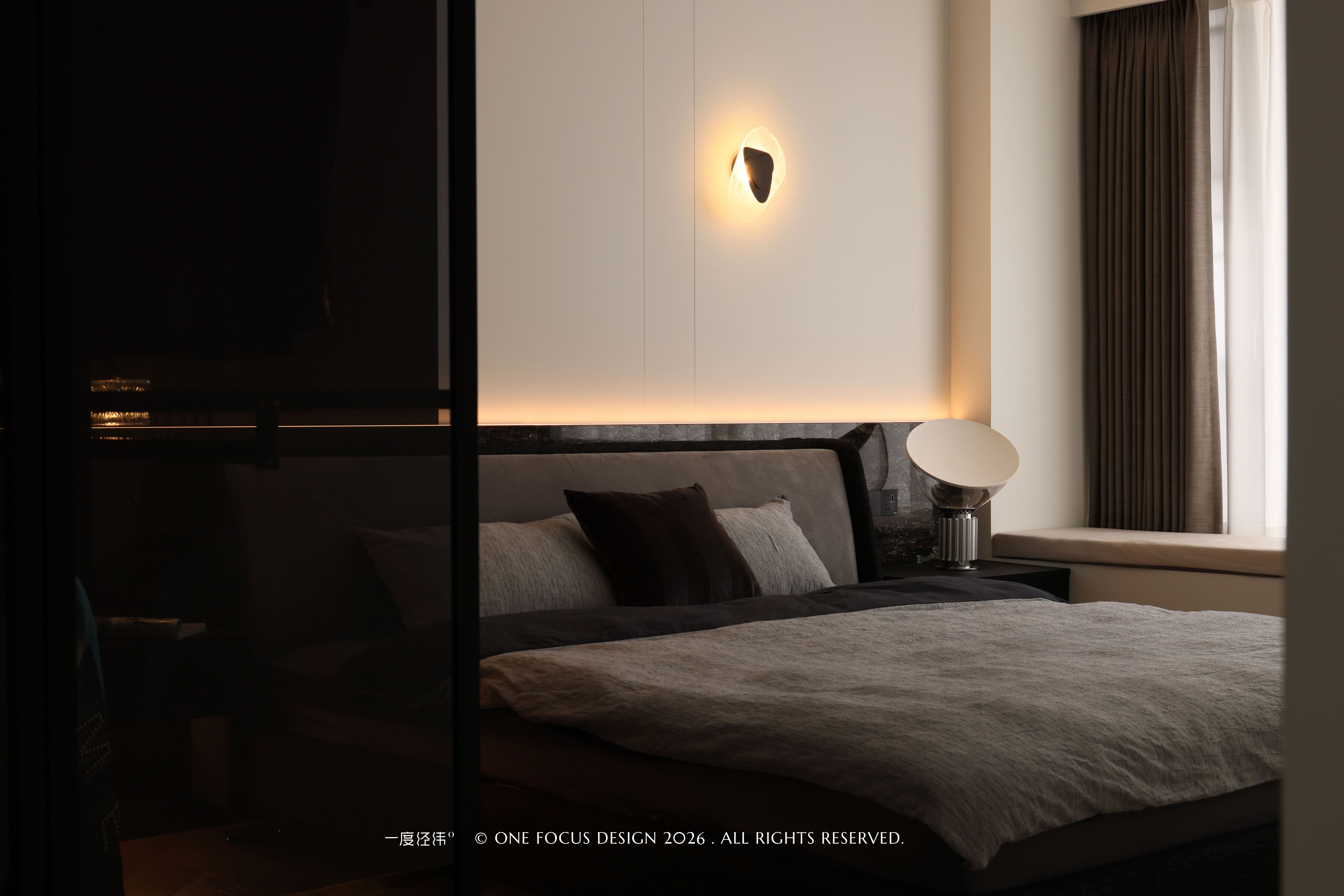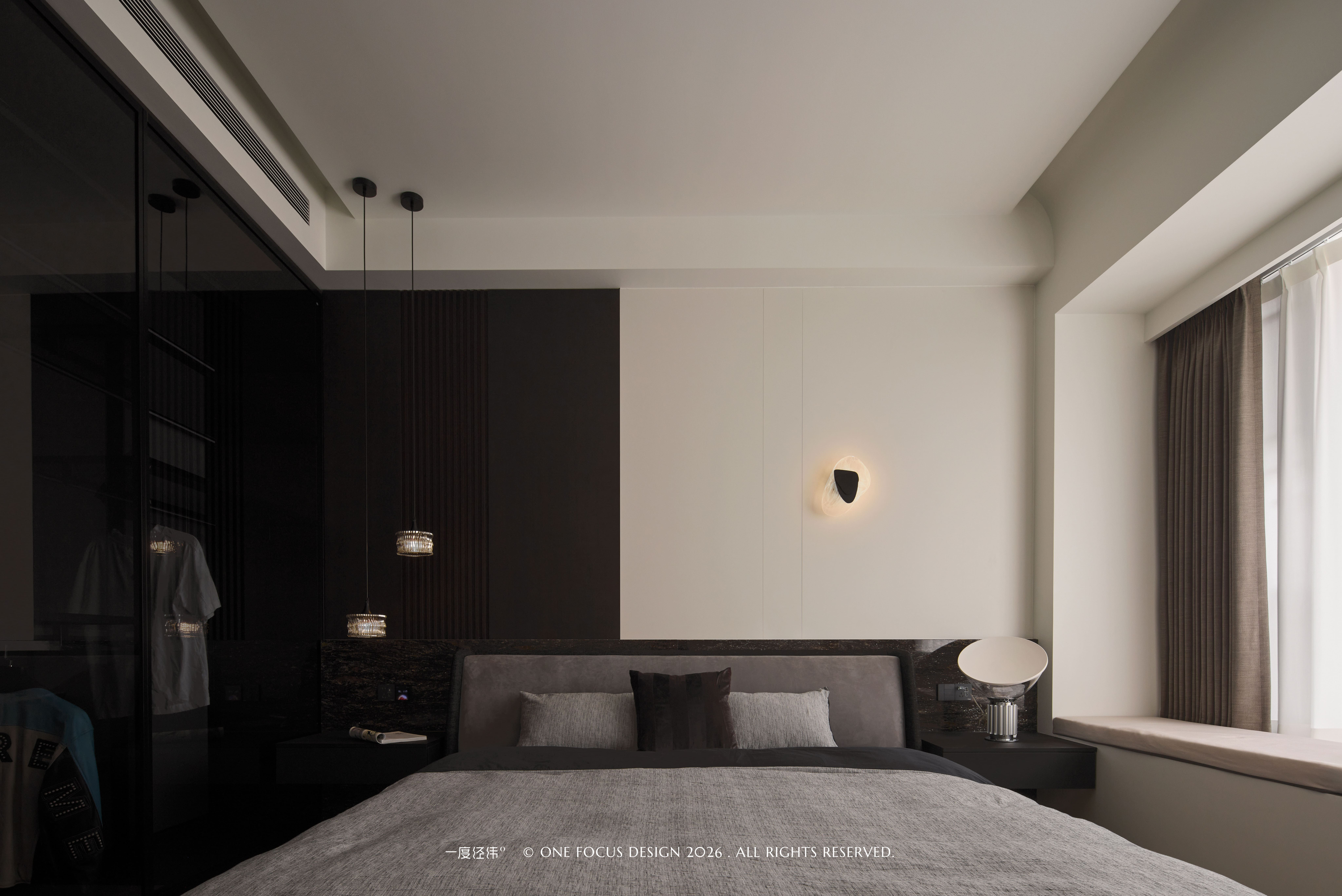 主卧以克制的浅灰与深棕为基调,浅灰布艺床品包裹着沉稳的深色大理石背景墙,在柔软与冷冽的材质对话中,勾勒出意式轻奢的优雅轮廓。墙面壁灯与床头吊灯的暖光如呼吸般漫射:弱化了空间棱角,将喧嚣隔绝于外,营造出静谧疗愈的休憩氛围。整面玻璃衣柜通透轻盈,既满足了衣物收纳的秩序感,又让空间不显压抑;飘窗的柔和线条则为私密感注入了一丝开阔,让每一次入眠都成为一场与自我的温柔对话。