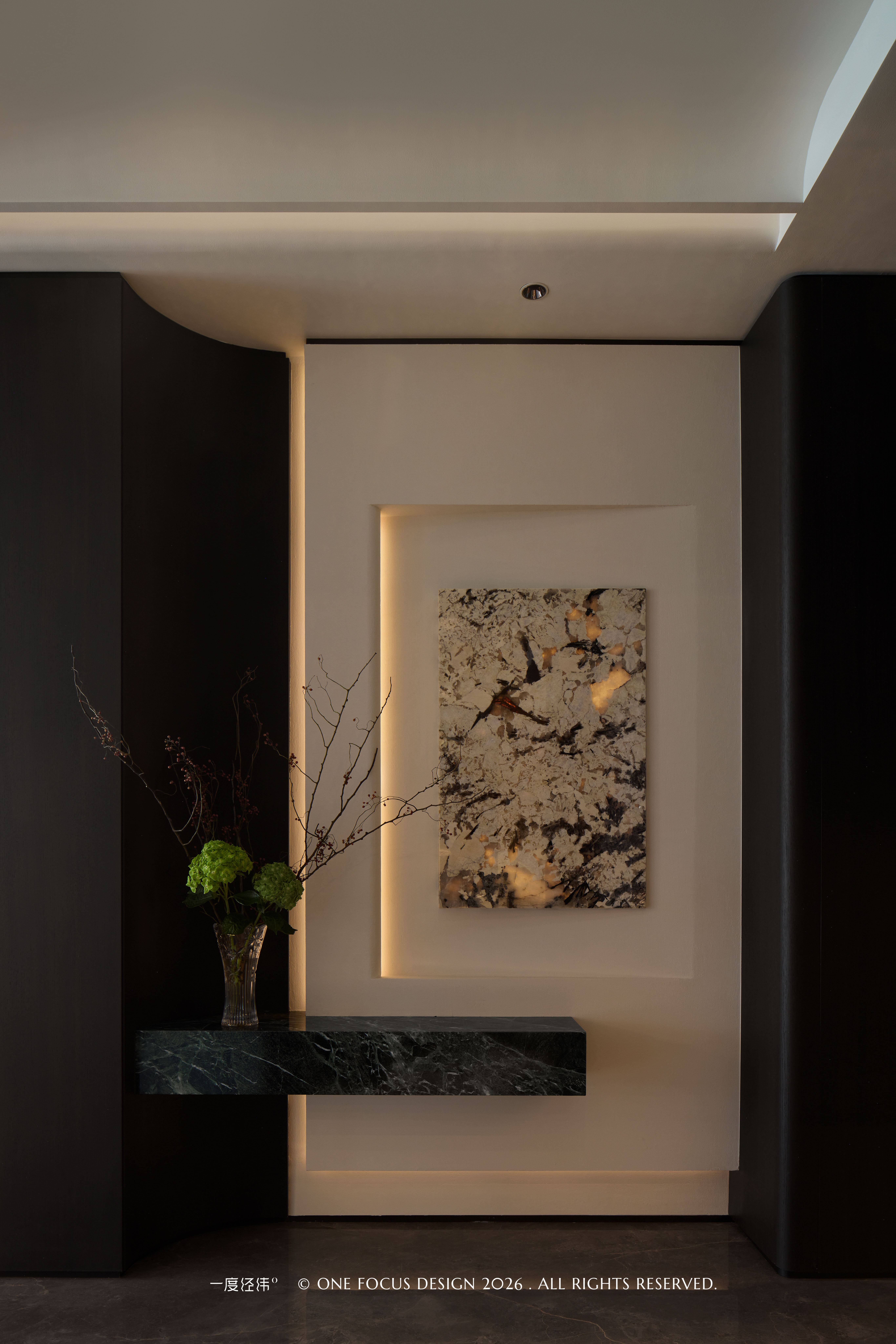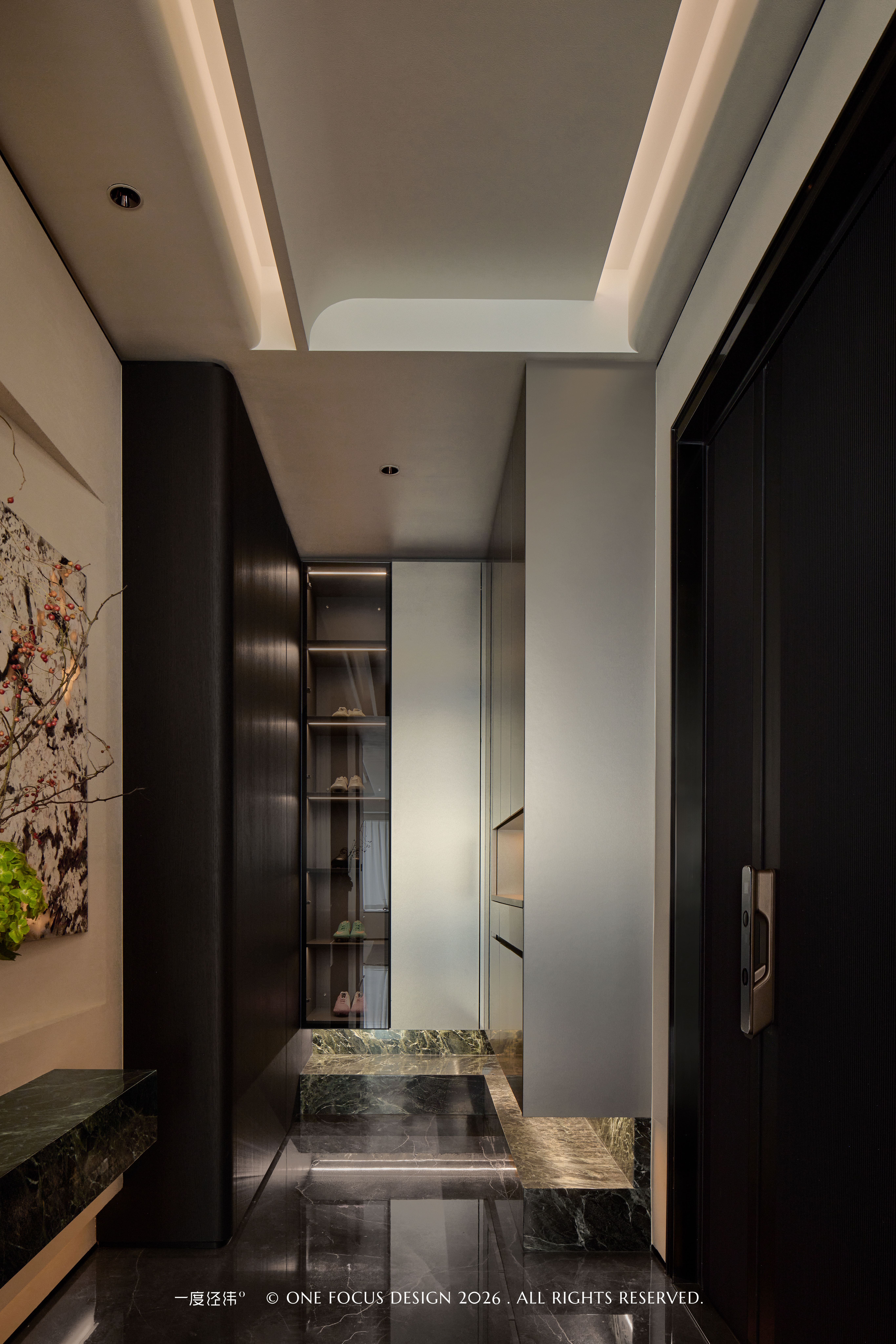 玄关以现代意式简约为基调,用深黑木作与冷翡翠大理石形成材质对话,石材墙面在隐藏灯带的映衬下,呈现出温润而高级的肌理。悬浮式大理石台几与透光大理石端景画,既满足了收纳与展示功能,又以艺术化的表达,为归家动线注入仪式感。右侧增设的鞋帽间,以通透玻璃与内藏灯带的柜体,在保证储物容量的同时,让空间更显轻盈有序,整体氛围精致大气,兼具实用与美学。