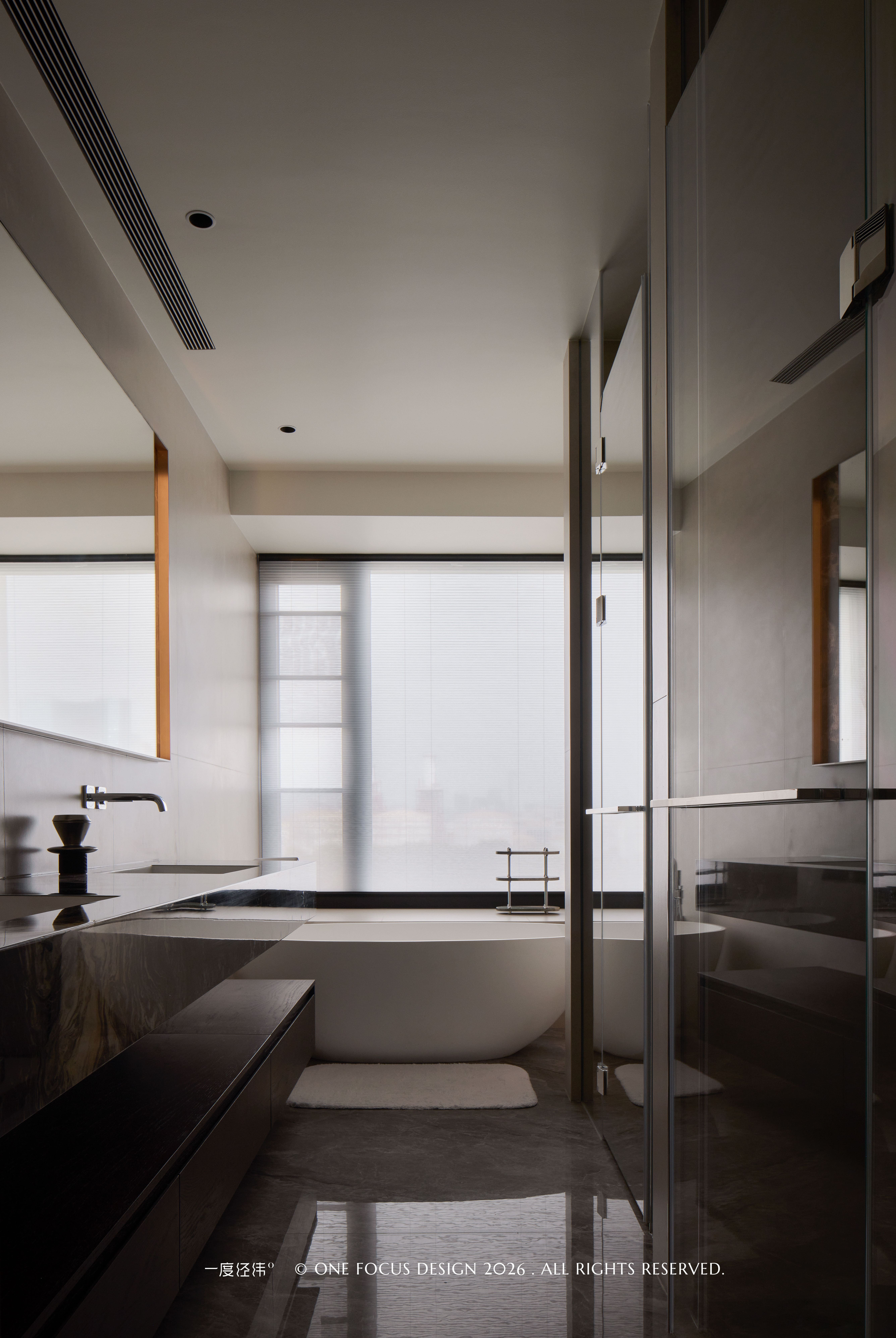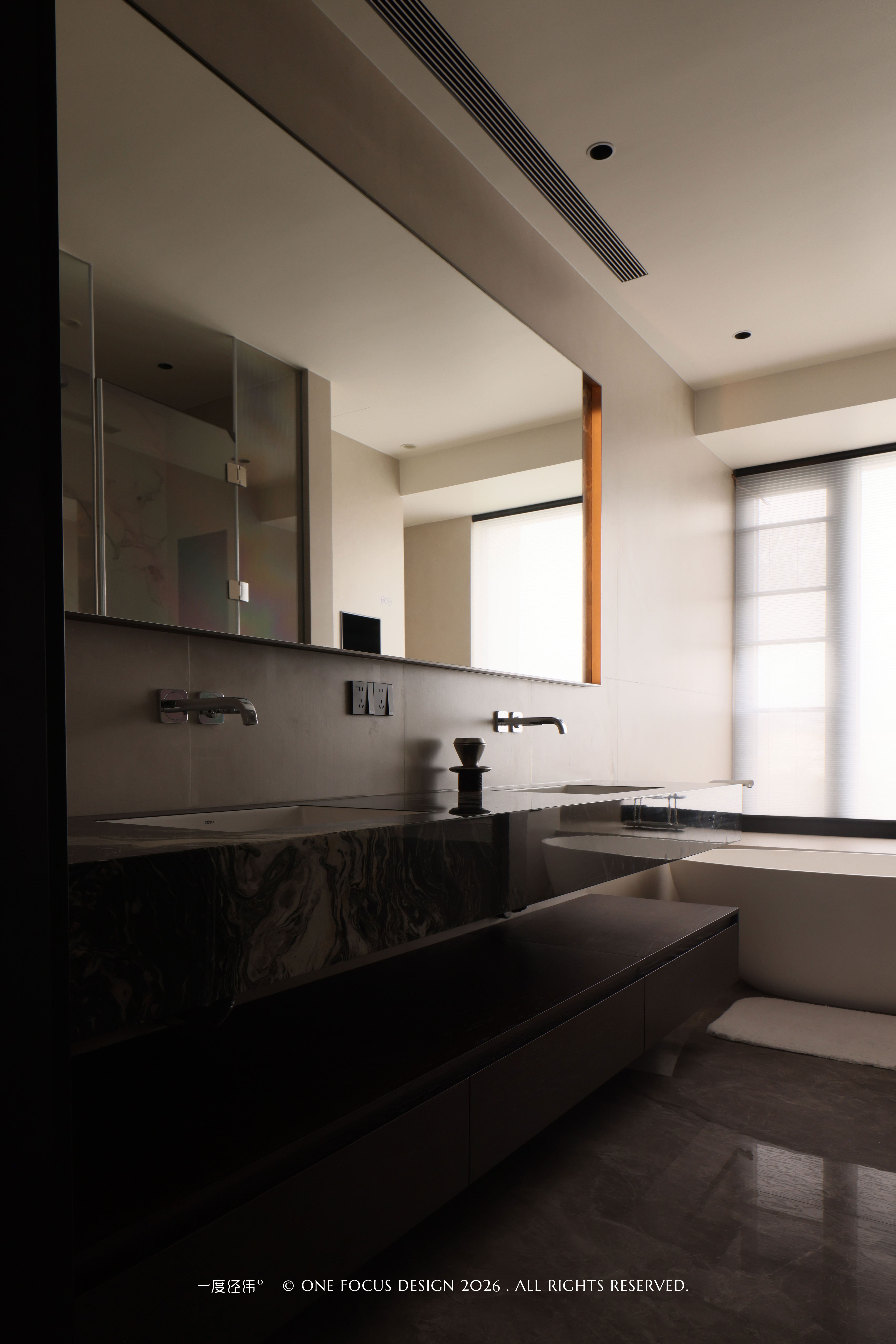 卫浴空间延续了整体的设计语言,冷翡翠大理石台面与深木柜体相互映衬,流动的石纹与温润的木色碰撞出高级质感。双台盆设计与独立浴缸的布局,将功能与美学平衡得恰到好处;大面积镜面与玻璃隔断,在视觉上拓展了空间深度,让日常洗漱也充满仪式感。线性灯带与自然光交织漫射,为这个私密场域注入了温润的意式格调,让每一次沐浴都成为一场身心舒展的奢享。